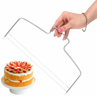 Oceľový krájač torty s dvoma strunami. Nastaviteľná výška strún. Kvalitné spracovanie, jednoduché používanie, Pohodlná rukoväť, certifikovaný výrobok. Ideálne na krájanie všetkých druhov tort.