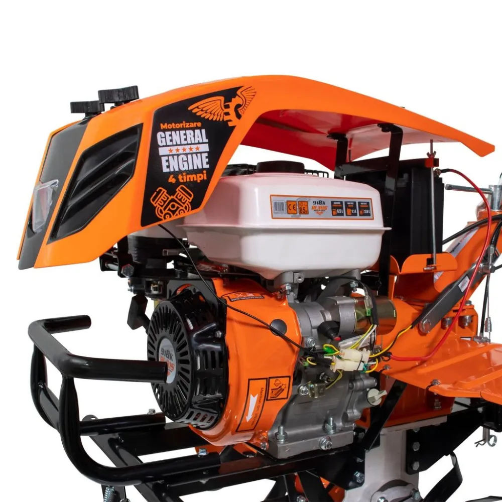 Profesionálny kultivátor s elektrickým štartovaním na kľúč. Kultivátor s motorom 18 HP General Engine a objemom valcov 460 ccm dokáže bez problémov kultivovať a orať akýkoľvek typ pôdy bez ohľadu na jej tvrdosť, pričom dosahuje hĺbku až 360 mm s účinnosťou cez 1500 m2/h.
