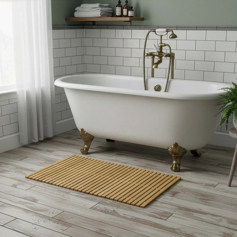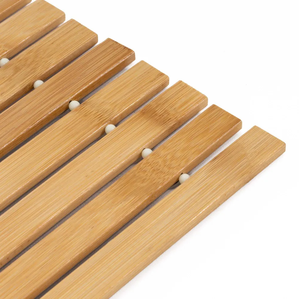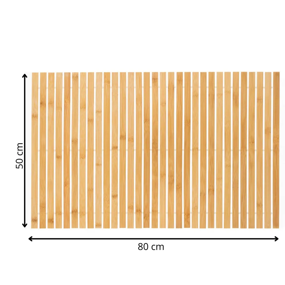 Prírodná bambusová predložka dodá kúpeľni elegantný a harmonický vzhľad. Vďaka lamelovému prevedeniu umožňuje rýchly odtok vody a ľahké schnutie, čo prispieva k hygiene. Protišmykové podložky na spodnej strane zaisťujú stabilitu pri používaní. Predložka je príjemná na došľap, odolná a skvele sa hodí k vani, sprche aj umývadlu.