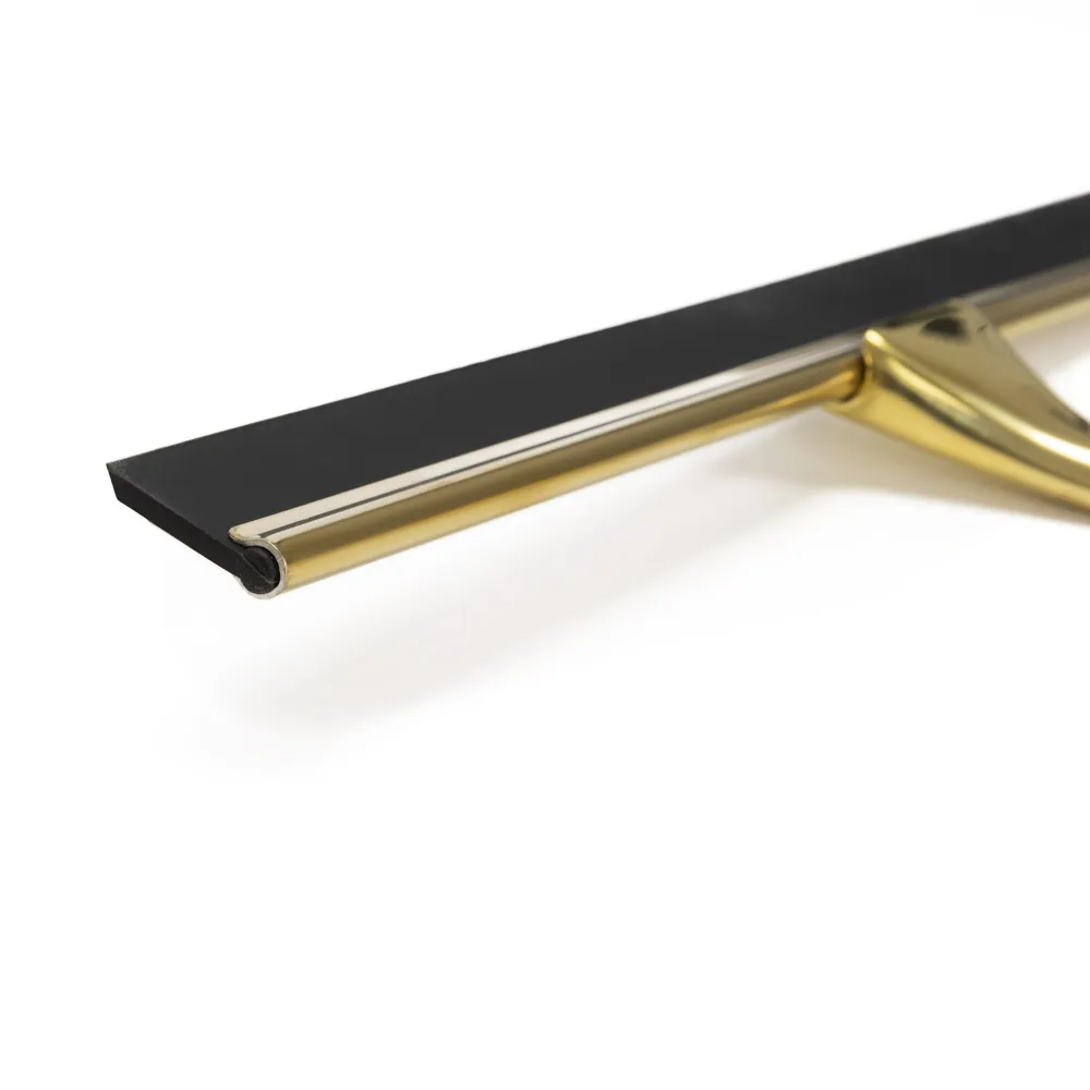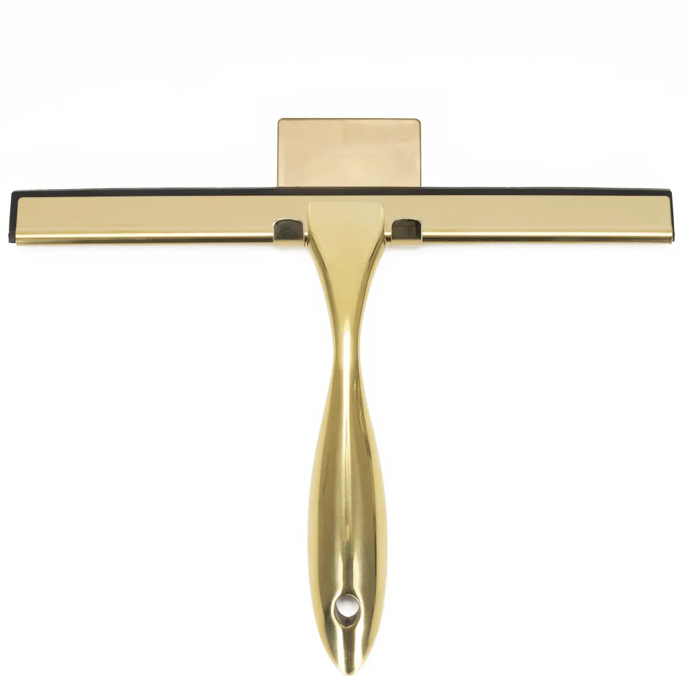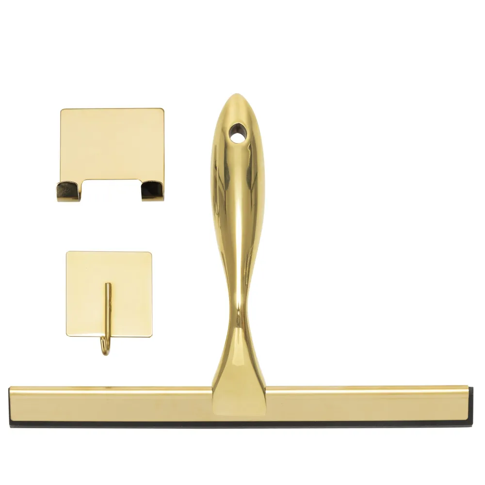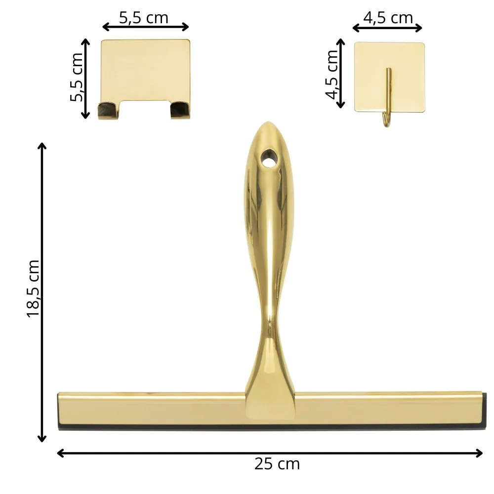 Praktická kúpeľňová stierka vhodná ako stierka do sprchy aj stierka do sprchového kúta. Hladká stieracia hrana zaistí účinné zotretie vody bez šmúh a pomáha obmedziť usadzovanie vodného kameňa. Ergonomická rukoväť umožňuje pohodlný úchop a jednoduchú manipuláciu. Prísavky na uchytenie umožnia praktické zavesenie priamo v kúpeľni, aby bola vždy po ruke. Elegantné zlaté prevedenie doplní moderný interiér. Rozmery 25x18,5 cm.