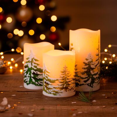 LED sviečky s prekrásnym vzorom zasneženého lesa vytvárajú teplé biele svetlo, ktoré verne pripomína plameň tradičnej sviečky. Vďaka kvalitnému spracovaniu, maximálne bezpečnej prevádzke a napájaniu na AAA batérie sú ideálnou dekoráciou pre každý interiér. V sade nájdete tri veľkosti 10/12/15 cm s praktickým posuvným vypínačom. Certifikácia IP20 garantuje bezpečnosť pri domácom použití.