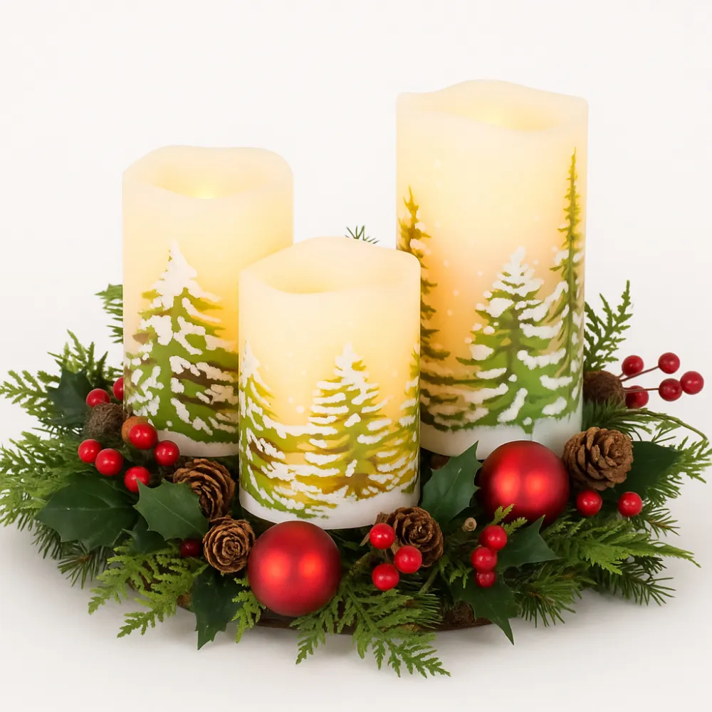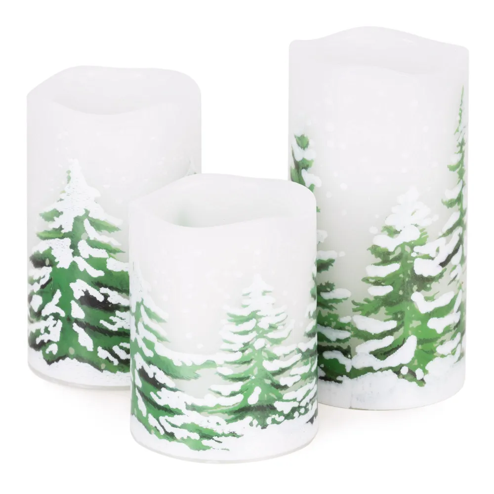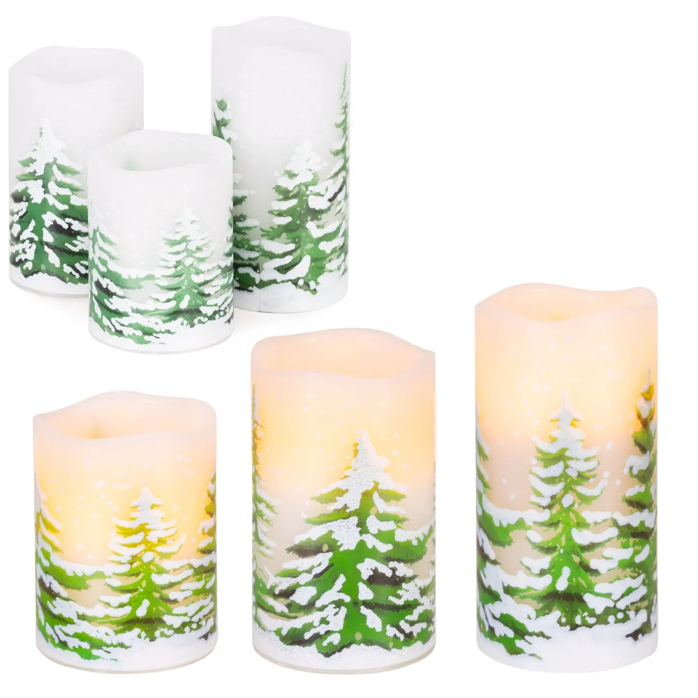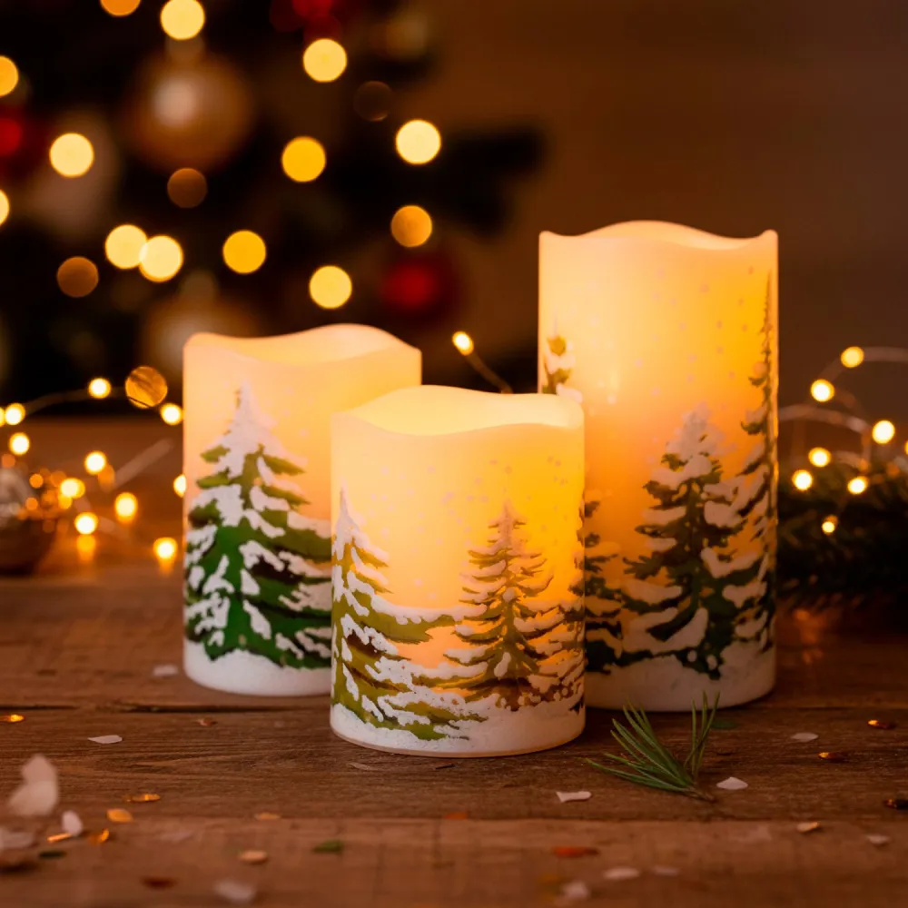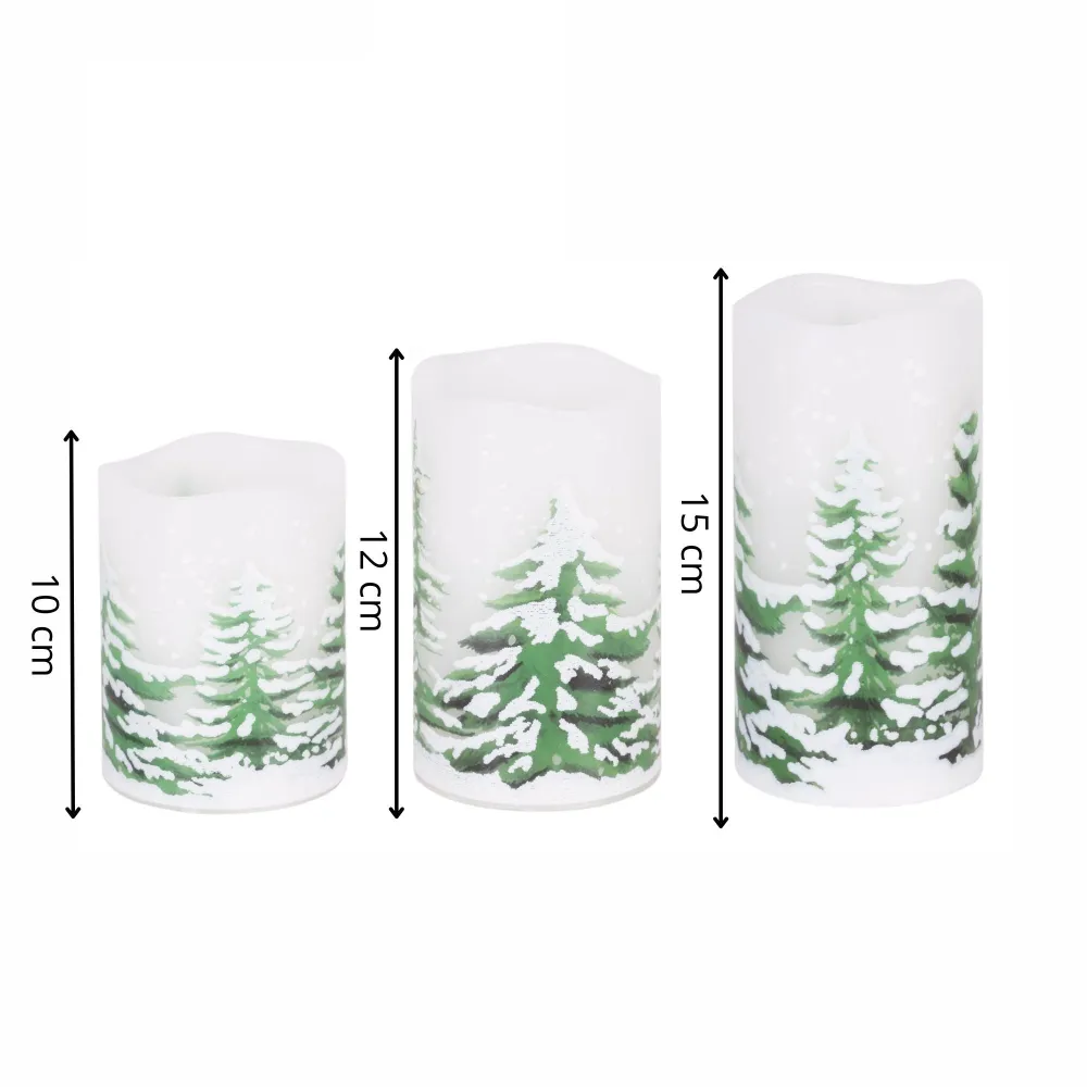 LED sviečky s prekrásnym vzorom zasneženého lesa vytvárajú teplé biele svetlo, ktoré verne pripomína plameň tradičnej sviečky. Vďaka kvalitnému spracovaniu, maximálne bezpečnej prevádzke a napájaniu na AAA batérie sú ideálnou dekoráciou pre každý interiér. V sade nájdete tri veľkosti 10/12/15 cm s praktickým posuvným vypínačom. Certifikácia IP20 garantuje bezpečnosť pri domácom použití.
