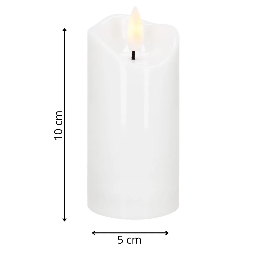 Elegantná LED sviečka s jemným, teplo žltým mihotajúcim svetlom. Dokonale imituje prirodzený plameň – vďaka pohyblivému efektu svetla a čiernemu knôtu, ktorý umocňuje realistický vzhľad skutočnej sviečky. Bezpečná alternatíva bez dymu a zahrievania, na 2× AA baterky. Ideálna ako univerzálna dekorácia do interiéru – na Vianoce, Halloween aj Dušičky ako cintorínska sviečka. Krytie IP 20, dlhá prevádzka. Rozmery: výška 10 cm, priemer 5 cm.