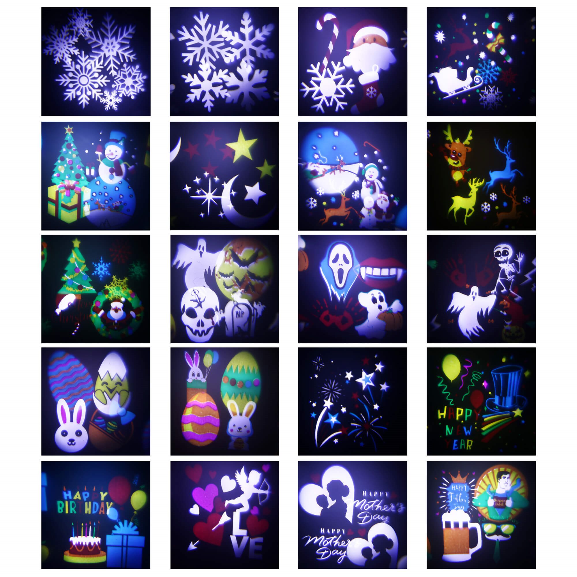 LED projektor ponúka 20 rôznych motívov projekcie na každú príležitosť. K dispozícii sú tieto témy: