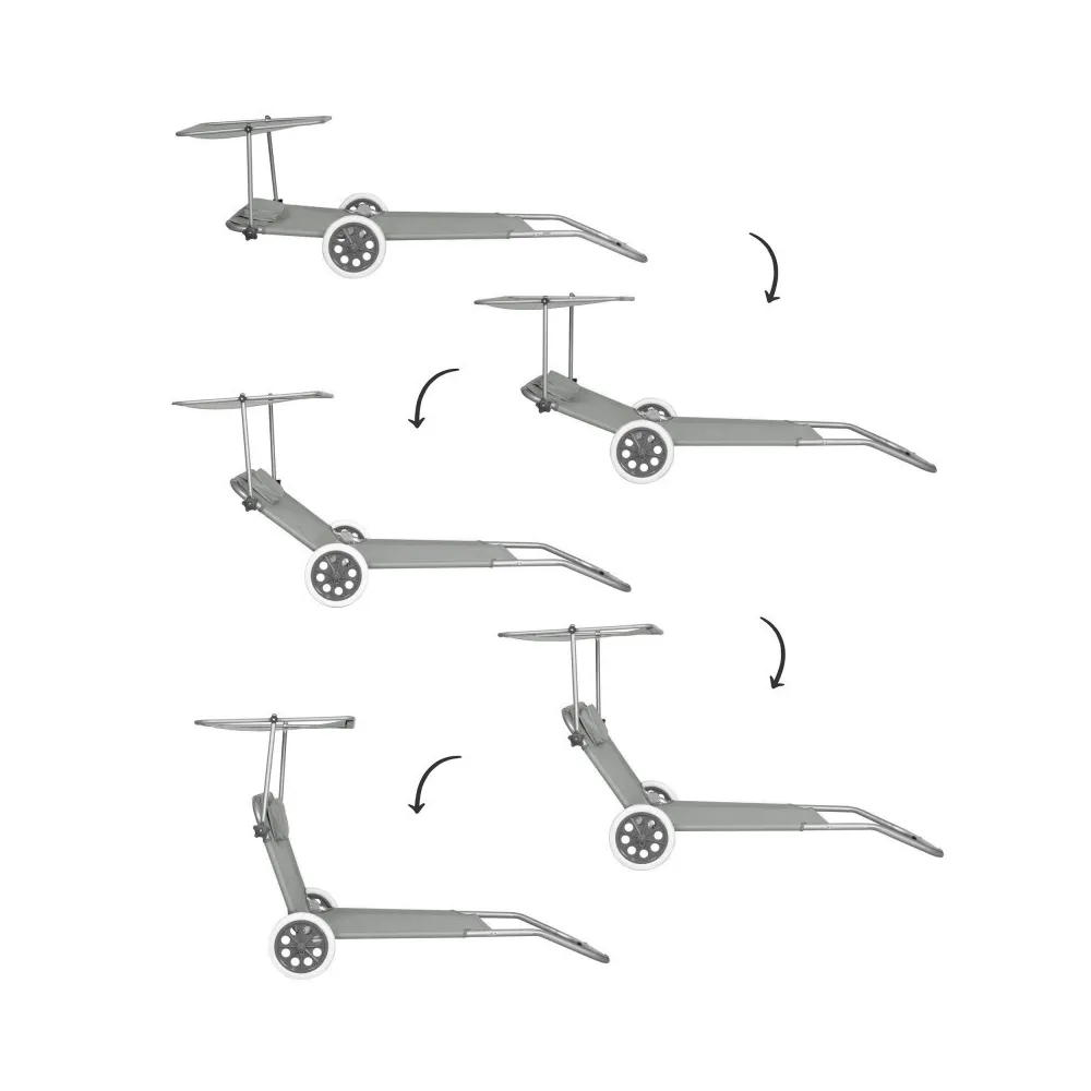 Mobilné plážové lehátko s nastaviteľným sklonom operadla a striešky. Vo výbave nechýbajú komfortné doplnky ako sú pojazdové kolieska, polstrovaný podhlavník, madlo na uchytenie alebo vstavaná sieťovaná taška.