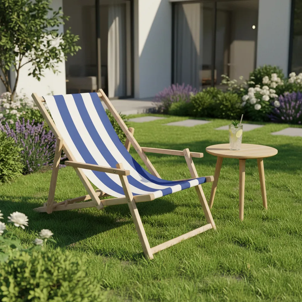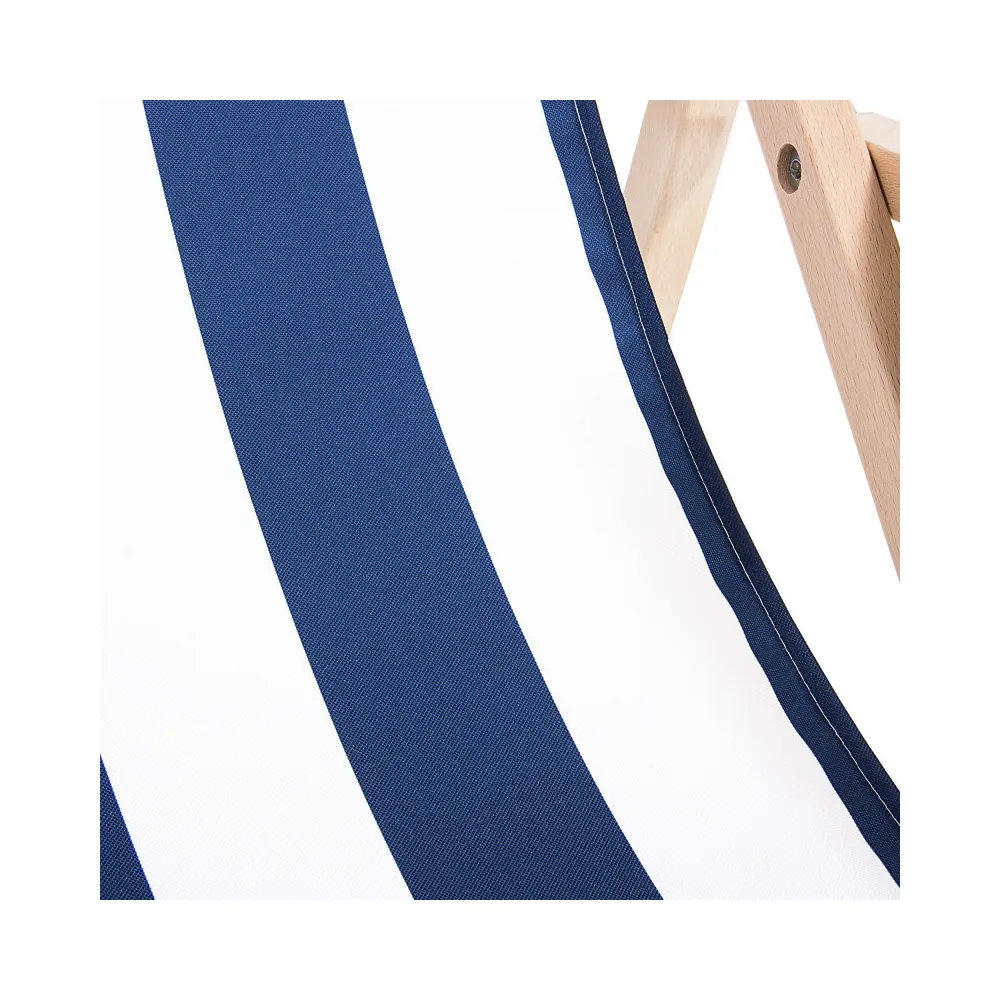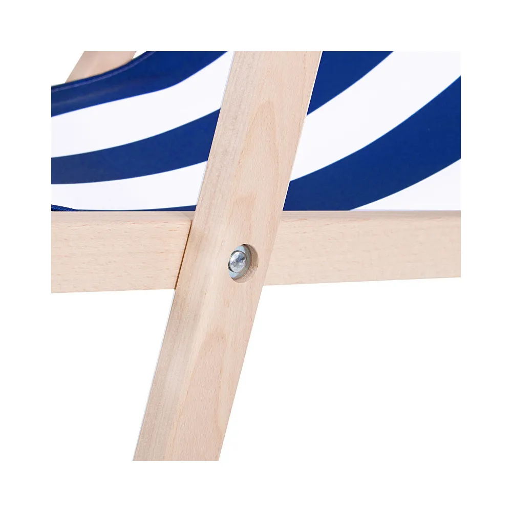 Záhradné drevené lehátko SPRINGOS TORINO modro-biele pruhy je ideálny pre relaxáciu na záhrade, terase aj v interiéri . Vďaka 3-stupňovému polohovaniu si ľahko nastavíte ideálnu pozíciu pre odpočinok. Opierky na ruky a pevný poťah zaisťujú maximálne pohodlie pri každom použití.
