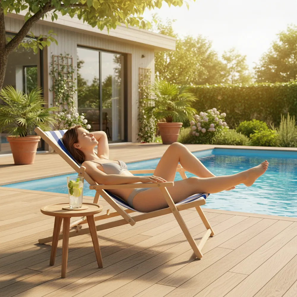 Konštrukcia z kvalitného bukového dreva zaručuje stabilitu a dlhú životnosť. Odolný textilný poťah je navrhnutý tak, aby vydržal UV žiarenie, vlhkosť i bežné opotrebenie . Bezpečnostná poistka zabraňuje nechcenému sklopeniu a zvyšuje celkovú bezpečnosť používania .