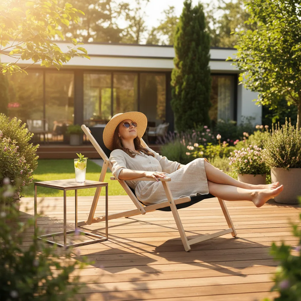 Konštrukcia z kvalitného bukového dreva zaručuje stabilitu a dlhú životnosť. Odolný textilný poťah je navrhnutý tak, aby vydržal UV žiarenie, vlhkosť i bežné opotrebenie . Bezpečnostná poistka zabraňuje nechcenému sklopeniu a zvyšuje celkovú bezpečnosť používania .