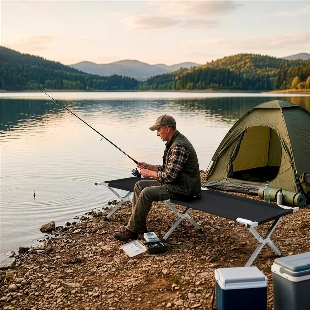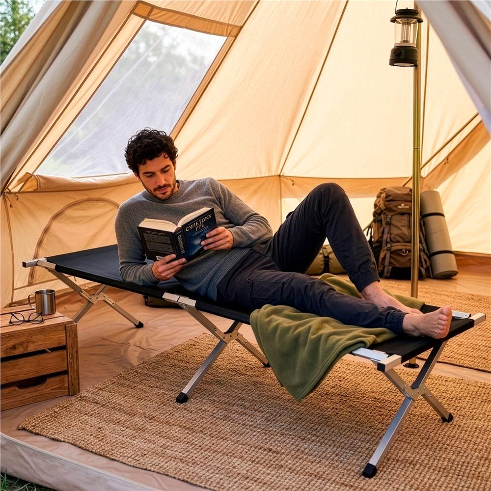 Kempingová posteľ má pevnú s stabilnú konštrukciu s nosnosťou 150 kg . Je veľmi odolná bez ohľadu na okolité podmienky. Dômyselný konštrukčný systém s priečnymi nosníkmi napína poťah a poskytuje telu patričnú oporu .