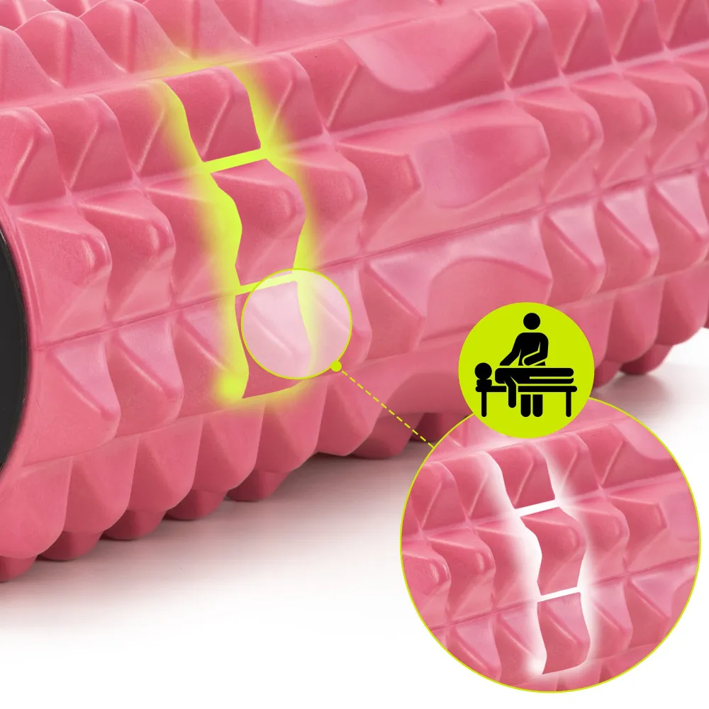 Masážny valec so špeciálnymi nopmi z EVA peny pre účinnú samomasáž a regeneráciu svalov. Vhodný na všetky svalové partie - krk, chrbát, zadok aj nohy. Tuhé jadro zaisťuje optimálny tlak aj pri intenzívnom tréningu. Odnímateľné koncovky slúžia ako praktický úložný priestor pre drobné príslušenstvo, napr. cvičiace gumy. Rozmery 33×13 cm, hrúbka peny 2 cm, stredná tvrdosť 50° Shore A.