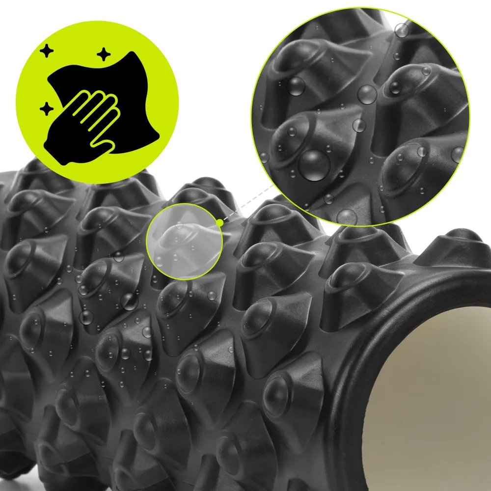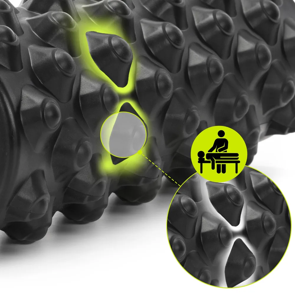 Masážny valec so špeciálnymi nopmi z EVA peny určený pre samomasáž a regeneráciu svalov po tréningu aj počas rekonvalescencie. Vhodný na všetky svalové partie - krk, chrbát, zadok aj nohy. Tuhé jadro je ideálne pre intenzívne trénujúce. Pomáha znižovať svalové napätie, zlepšovať pohyblivosť a urýchľovať regeneráciu. Rozmery 33×13 cm, hrúbka peny 2 cm, stredná tvrdosť 50° Shore A.