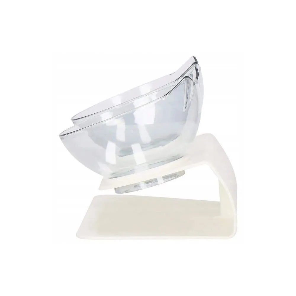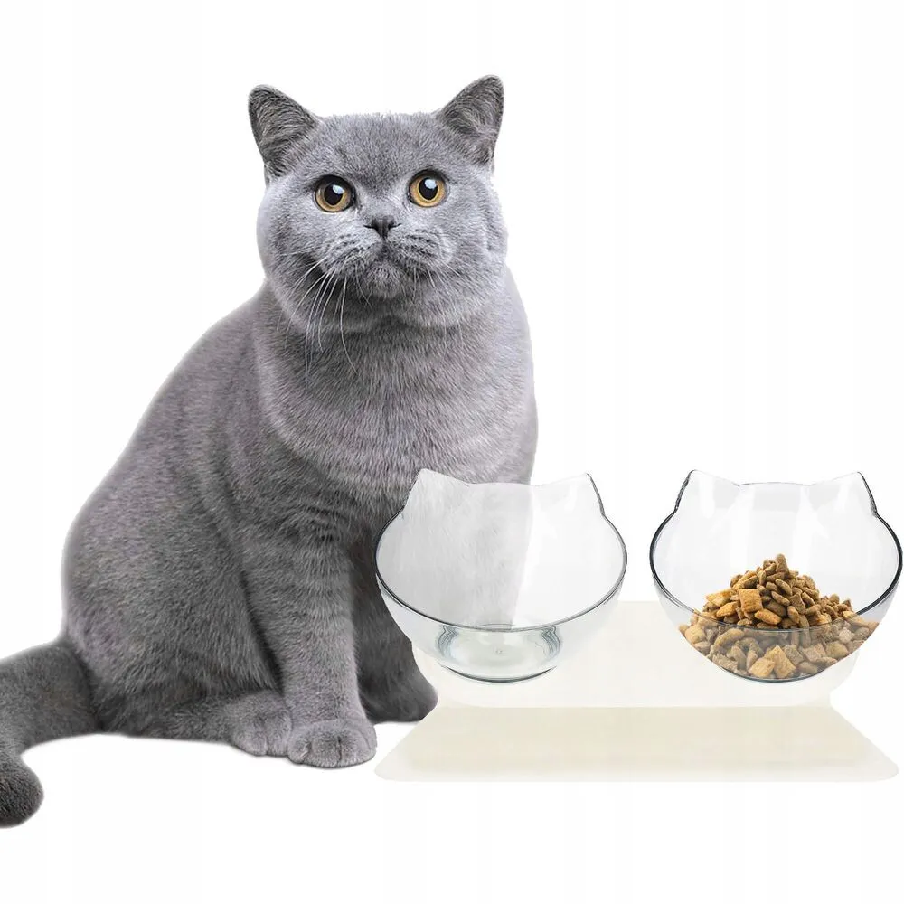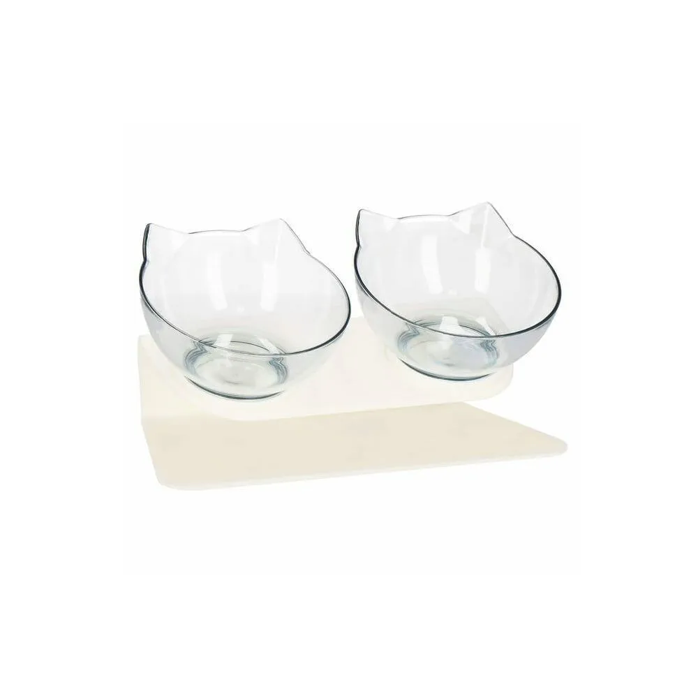 Dvojitá miska pre domácich miláčikov. Vyvýšený stojan, ergonomicky naklonený držiak misiek, protišmyková základňa, štýlový tvar misiek s ušami pre psa alebo mačku. Úplne bezpečný a nerozbitný plastový materiál.