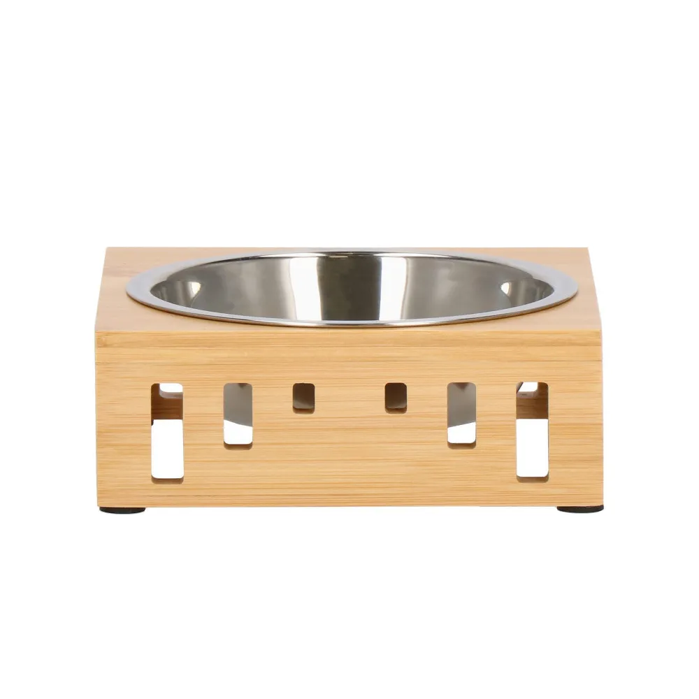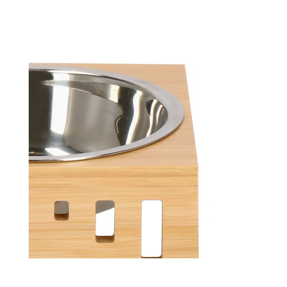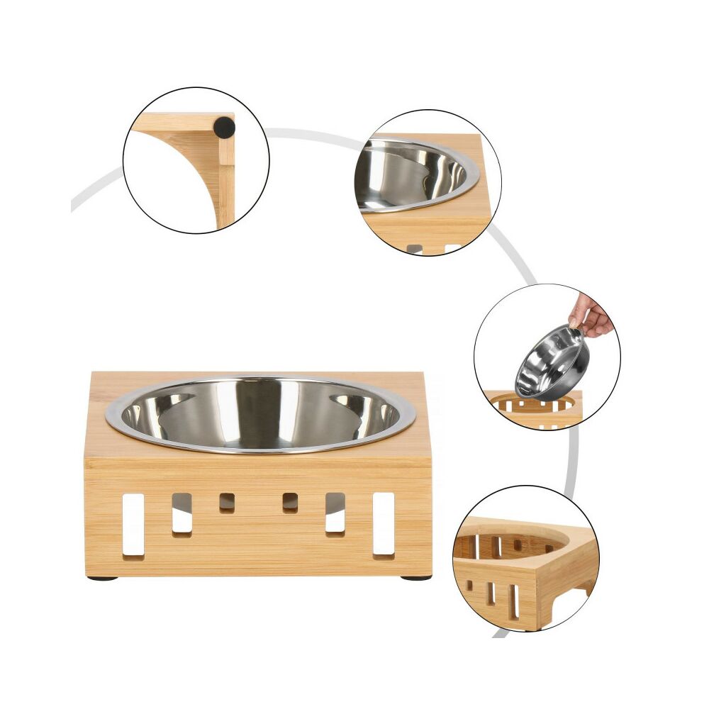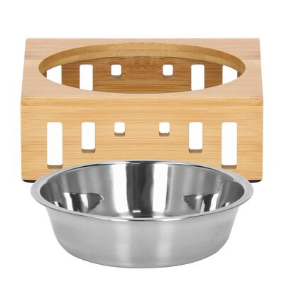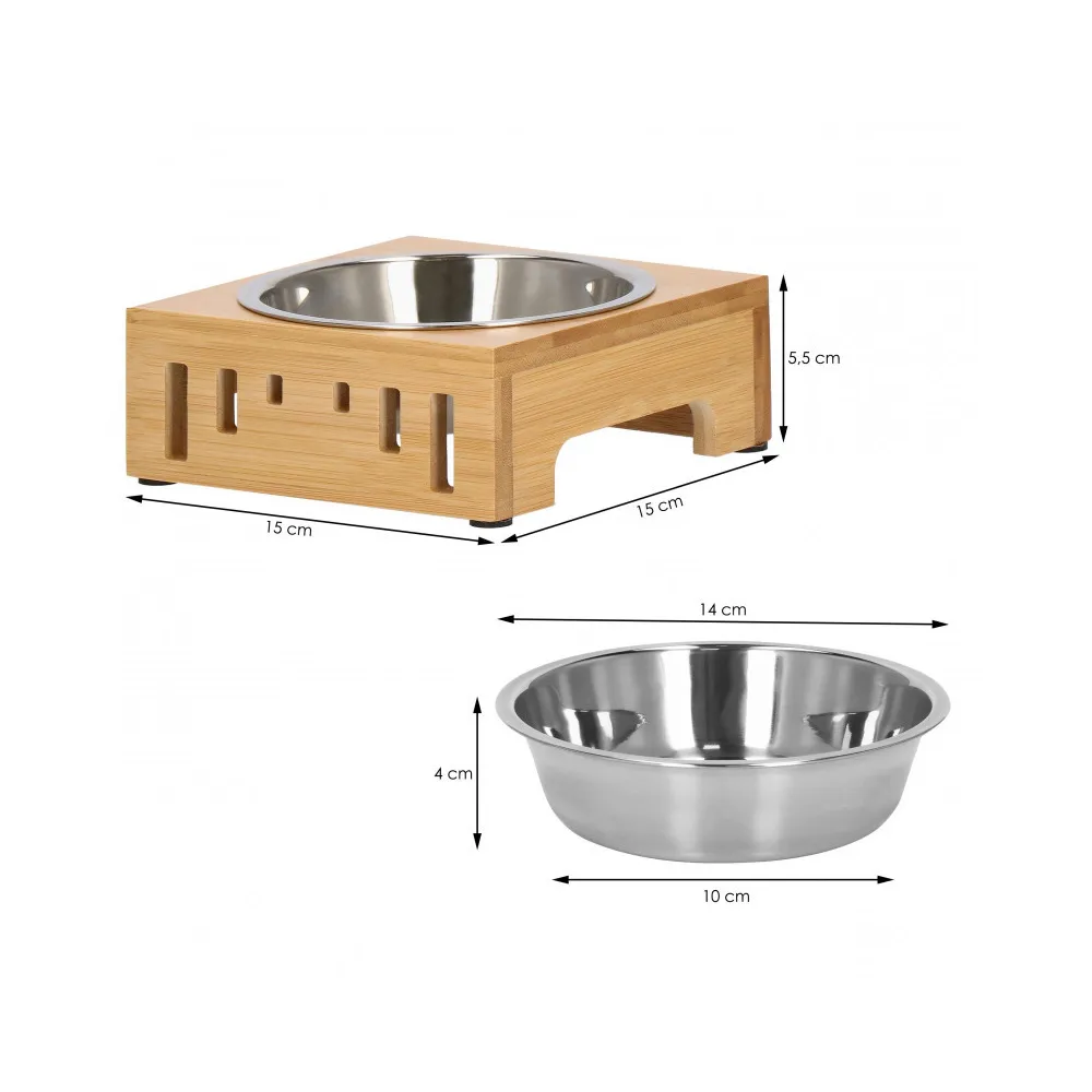 Nerezová miska v bambusovom stojane. Elegantný a jedinečný vzhľad. Odolný, netoxický a trvanlivý materiál. Stabilná základňa, jednoduchá údržba. Vhodné pre psy, mačky a menšie domáce zvieratá.