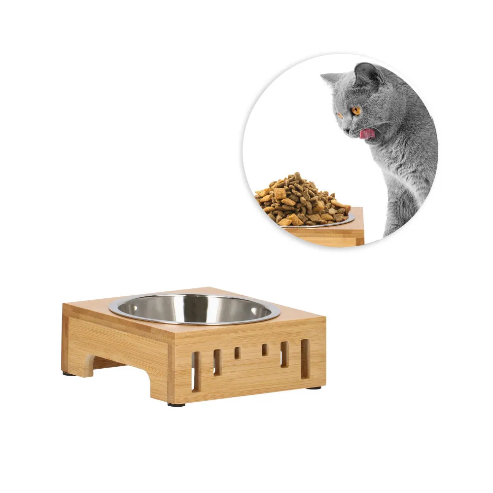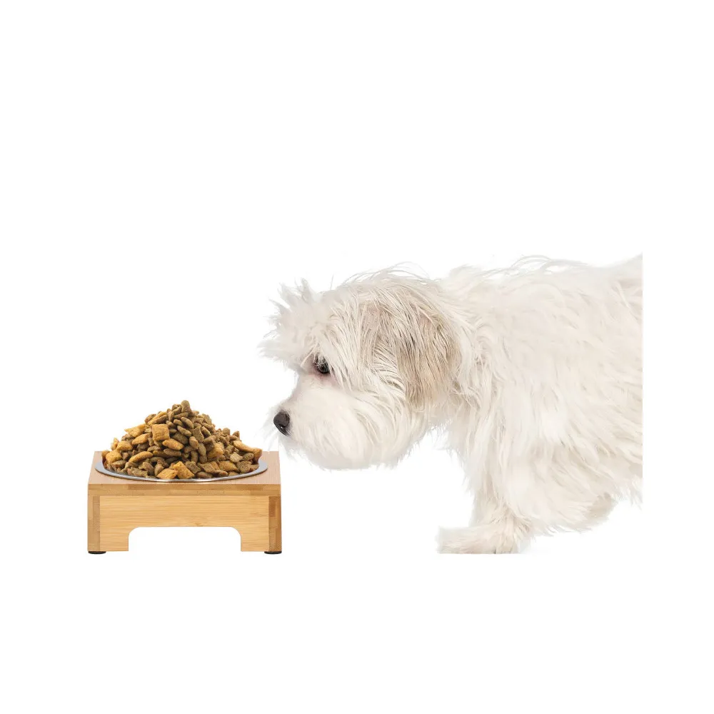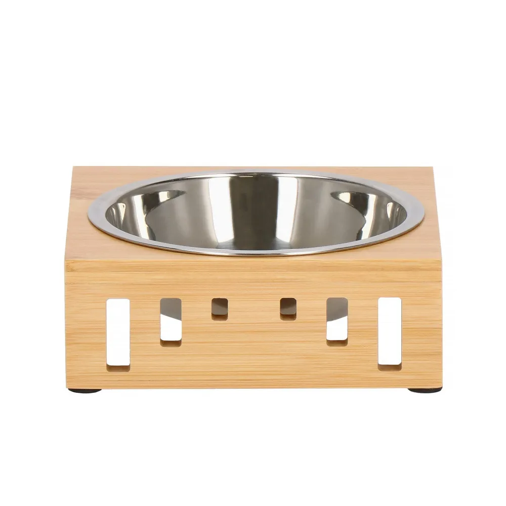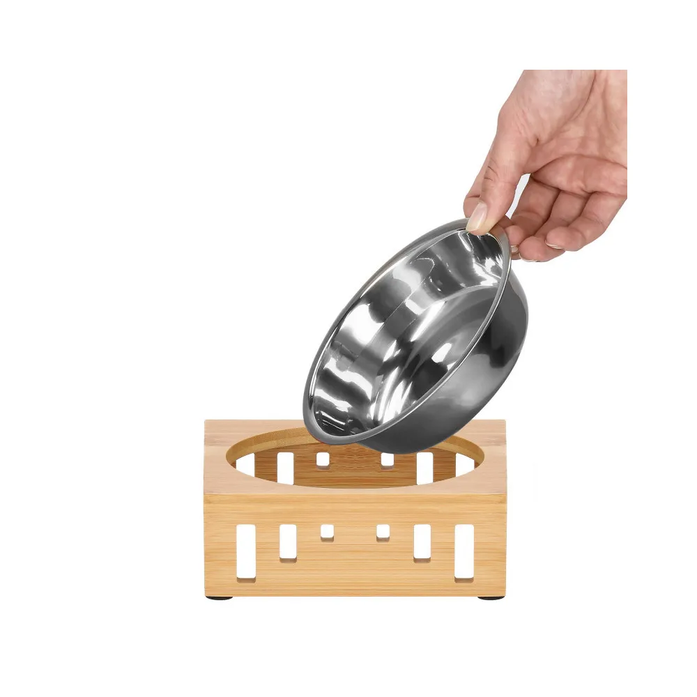 Nerezová miska v bambusovom stojane. Elegantný a jedinečný vzhľad. Odolný, netoxický a trvanlivý materiál. Stabilná základňa, jednoduchá údržba. Vhodné pre psy, mačky a menšie domáce zvieratá.