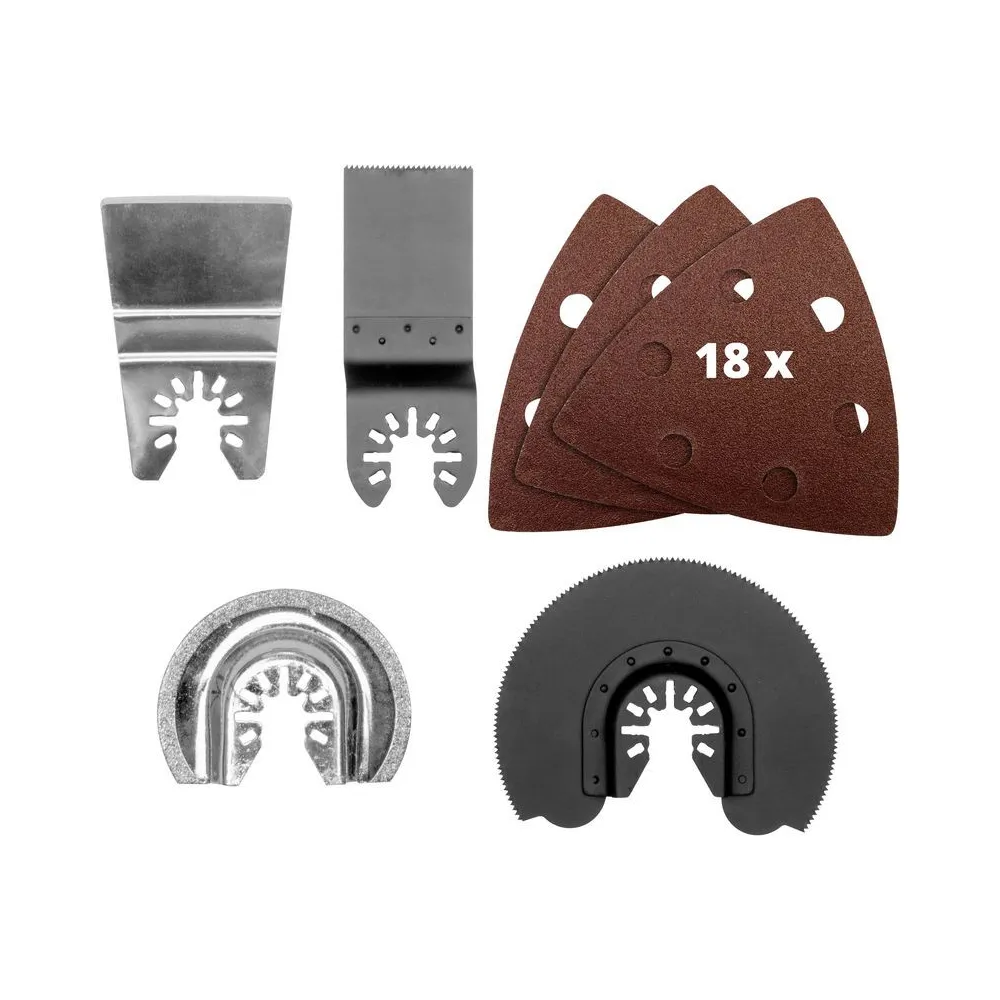 Akumulátorové multifunkčné náradie zo série akumulátorového náradia 18V e3 na rýchlu a precíznu prácu. Rezanie, delenie, zoškrabávanie a brúsenie iba jedným prístrojom. Elektronická regulácia otáčok/počtu kmitov, jednoduchá výmena nástrojov bez použitia náradia. Hliníková hlava prevodovky s dlhou životnosťou. Maximálne možnosti využitia aj v najužších rohoch a hranách. Obsahuje prípoj pre externé odsávanie, antivibračná prídavná rukoväť Softgrip, brúsny tanier, l ist priamočiarej píly, škrabák, diamantový rezací kotúč, segmentovaný pílový kotúč , brúsny papier (3xP60; 3xP80; 3xP120; 3x; 3xP120; 3xP320). K valitnej prepravnej kufrík s kovovými prackami.