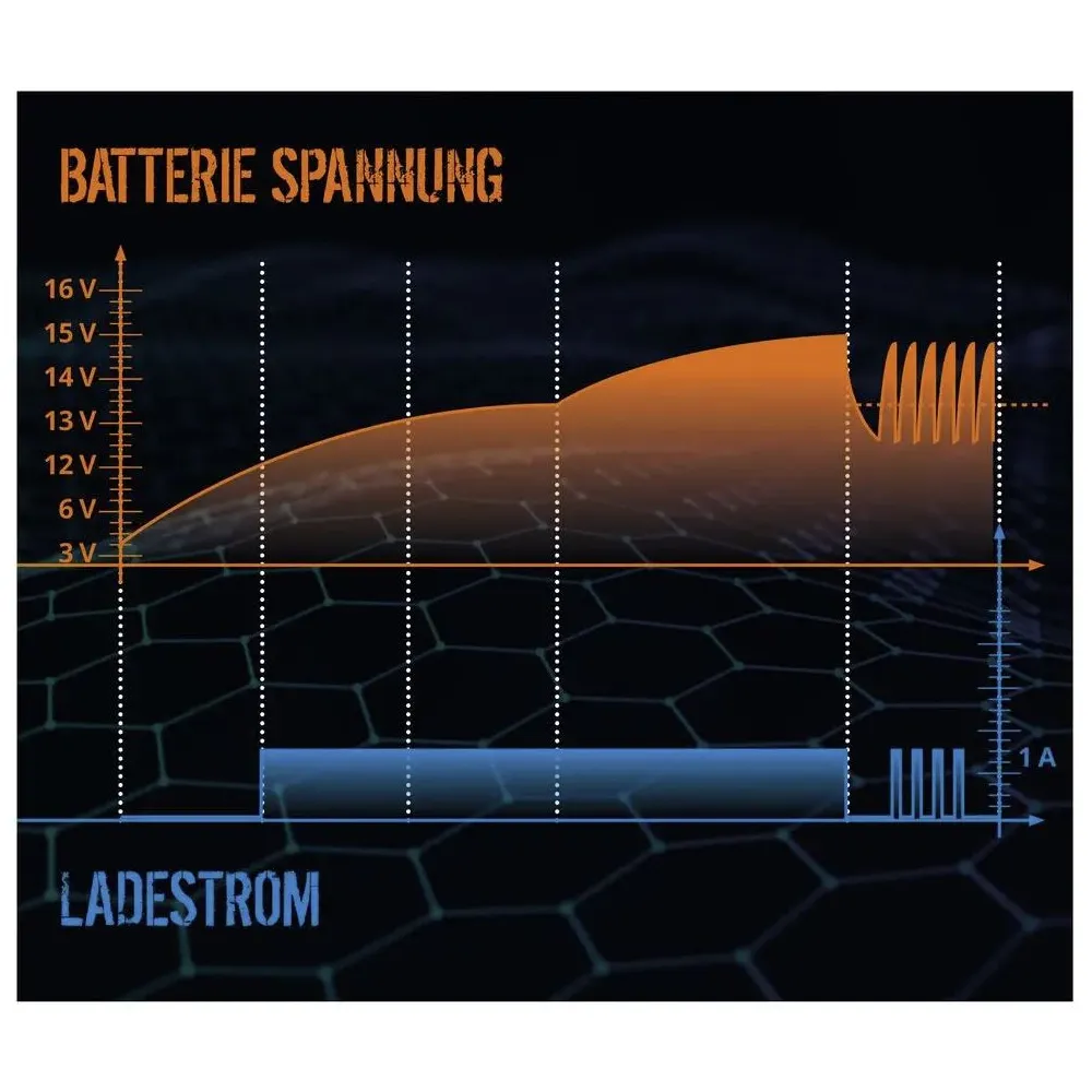 Invertorová technológia pre efektívne využitie energie, procesorom riadená technológia inteligentného nabíjania, 6-stupňové plne automatické nabíjanie šetriace batériu. Pre všetky bežné typy batérií 6 a 12 V. Permanentné udržiavacie nabíjanie, možné priame nabíjanie batérie pripojenej vo vozidle. Ochrana proti prepólovaniu a skratu. Špeciálny obnovovací režim, obzvlášť pre hĺbkovo vybité batérie. Plne izolované svorky batérie, s praktickým uškom na zavesenie.