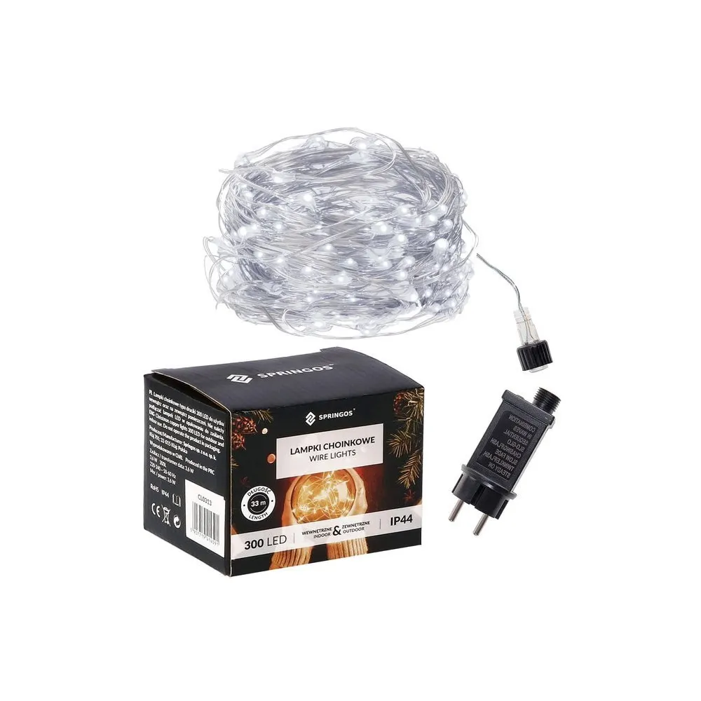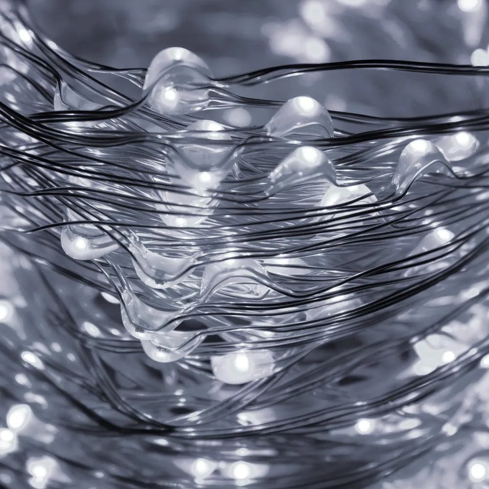 Ultratenká svetelná reťaz s programátorom a 8 svetelnými funkciami. Adaptér na bezpečné napätie, ultra úsporné nano led diódy, neviditeľný kábel. Vnútorné aj vonkajšie použitie, vodeodolné prevedenie, krytie IP44. Dĺžka svetelnej časti 30 m, napájací kábel 3 m. Farba studená biela, 300 ľad.