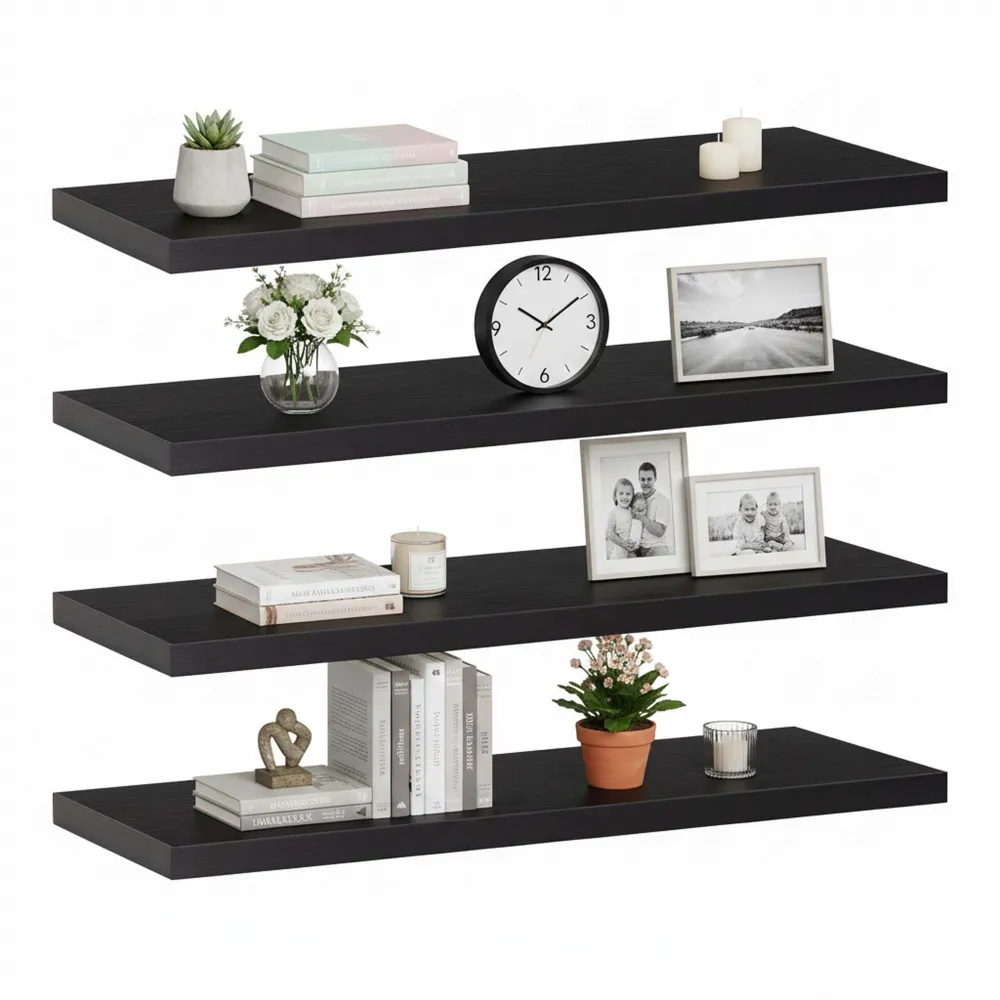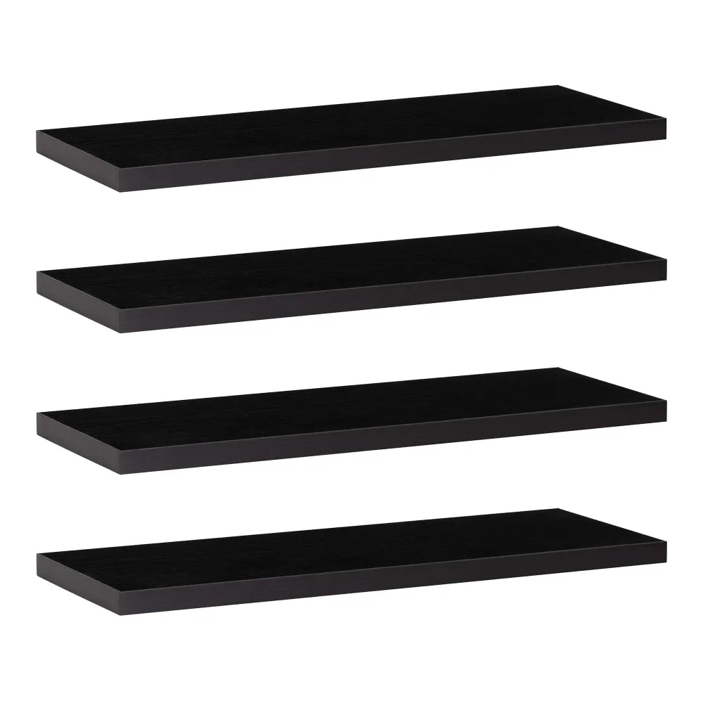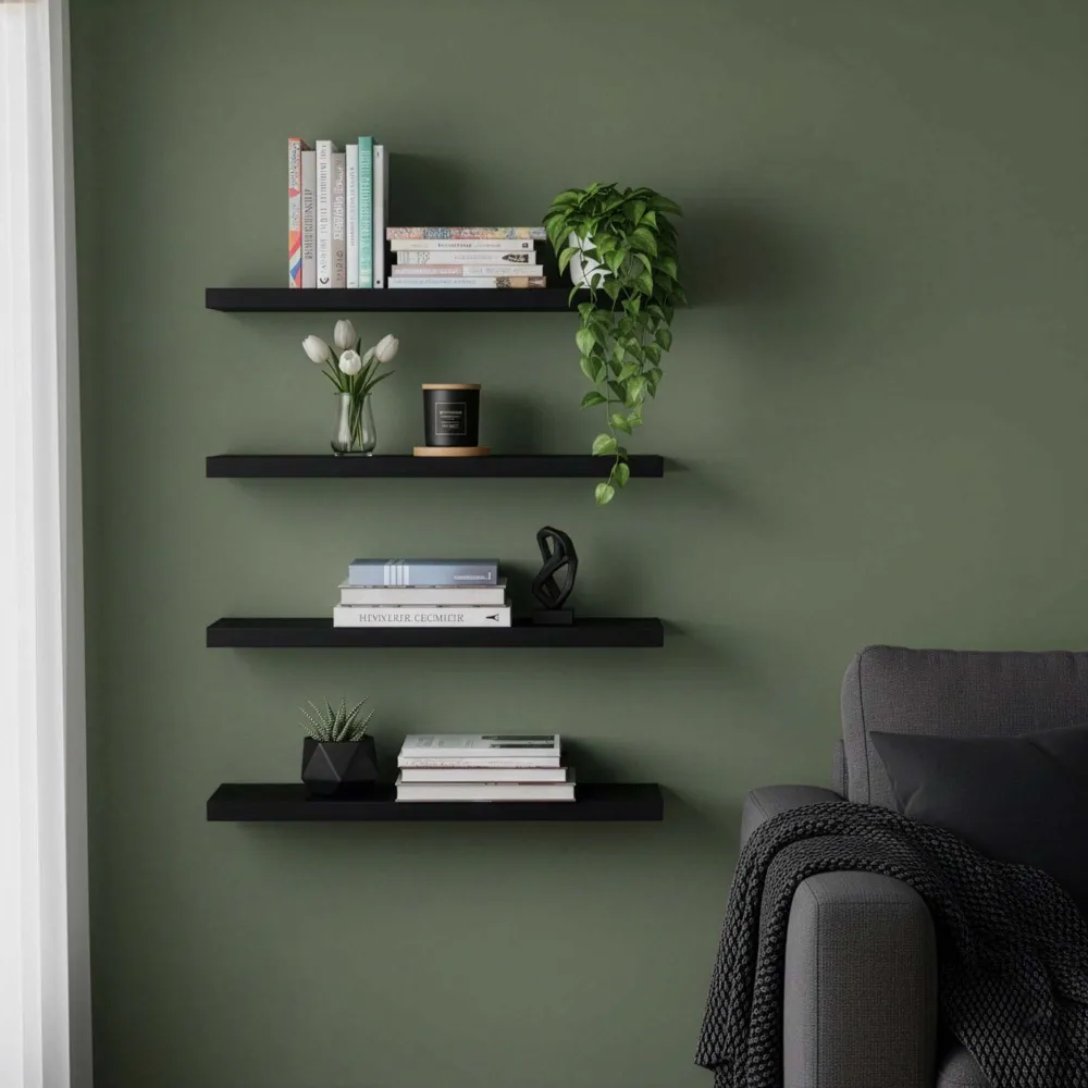 Polica na stenu sada 4 ks SPRINGOS HF0053 čierne sú štýlovým a praktickým doplnkom každého moderného interiéru. Ich moderný dizajn , nadčasové čierne prevedenie a čisté línie pôsobia elegantne a umožňujú ľahké zladenie s ostatným vybavením domácnosti. Vďaka svojej univerzálnosti sú vhodné do obývacej izby, spálne, pracovne i predsiene a skvele poslúžia na vystavenie dekorácií, kníh, fotografií či kvetín.