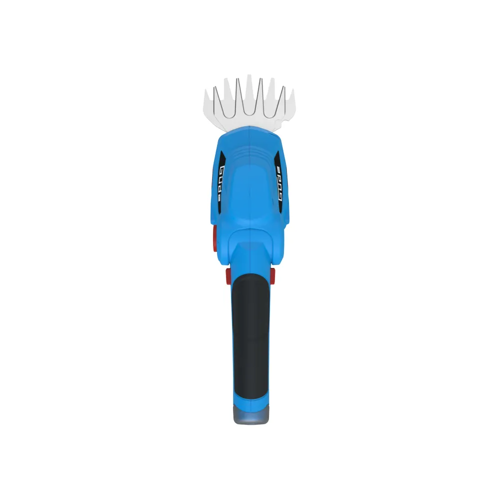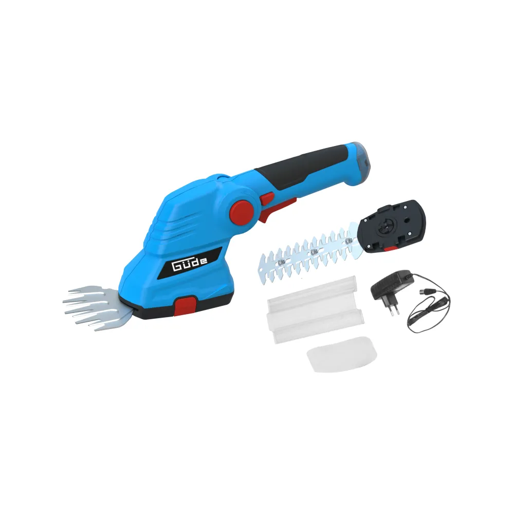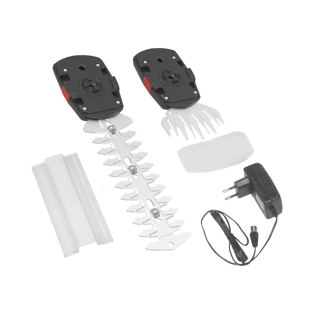 Akumulátorový záhradnícky set s násadou na strihanie trávy, násadou na strihanie živých plotov a kríkov, integrovaným akumulátorom 7,2 V / 1,5 Ah, vrátane nabíjačky. Trojpolohová sklopná rukoväť, rýchla výmena nožníc na trávu alebo nožníc na živé ploty/kriky bez použitia náradia. Čas nezaťaženého voľnobehu nožníc na trávu približne 55 minút a násady na strihanie živých plotov a kríkov približne 85 minút.