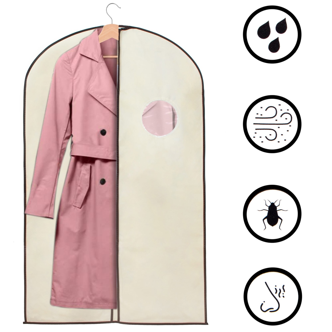 Obliečka na oblečenie je ideálnym doplnkom, ktorý sa bude skvele hodiť v šatníku aj na cestách. Skvelá ochrana odevu proti nečistotám, ošúchaniu alebo vlhkosti. Krémová farba s hnedým lemovaním, vodeodolné vlastnosti, chránič má zárez na ramienko, zips a priehľadné okienko. Rozmer 130x60cm.