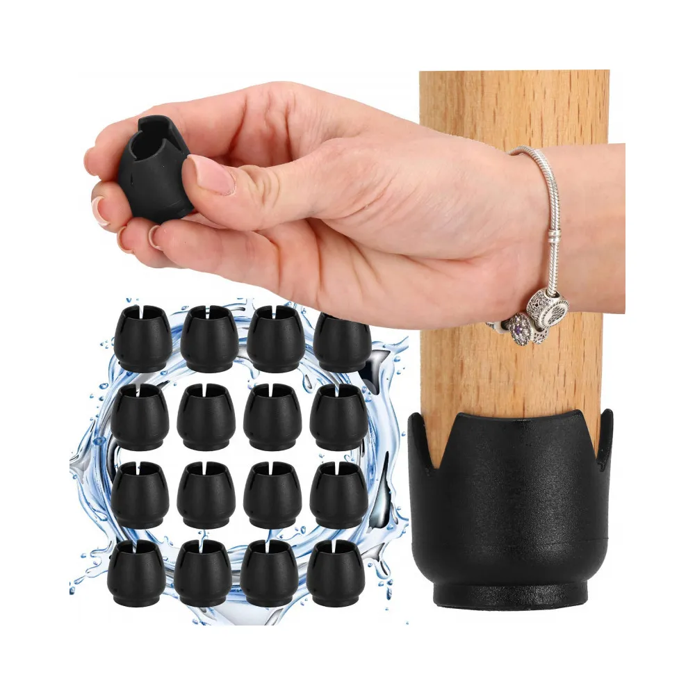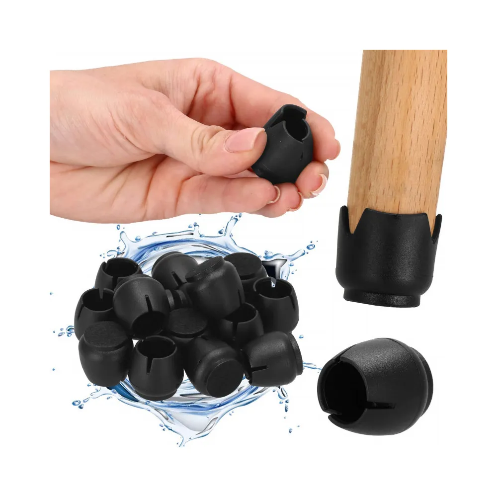 Plastové kryty na stoličky alebo iný nábytok. Skvelá alternatíva k plsteným podložkám. Bez potreby lepidla. Návleky sú v čiernej farbe, trvanlivé, pružné a odolné proti oderu. Vodotesné a vodeodolné. Opakovane použiteľný výrobok, výborne tlmí zvuky. Dokonale chráni podlahu proti poškriabaniu.