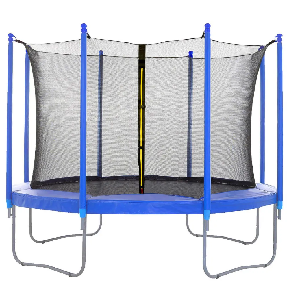 Vstupný otvor je zaistený zipsom a bezpečnostnými prackami proti nechcenému otvoreniu. Spodná strana je vybavená pružnými pásikmi s karabínkou pre ľahké upevnenie ku konštrukcii trampolíny.