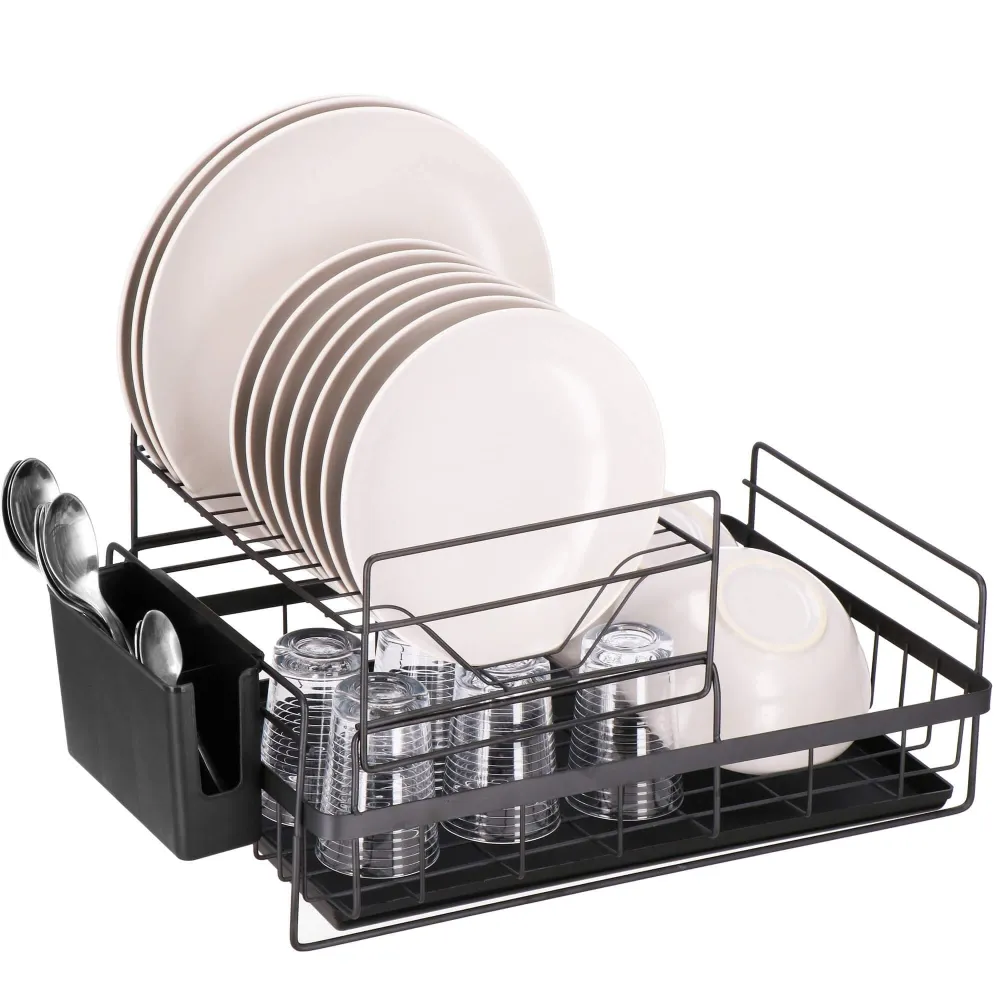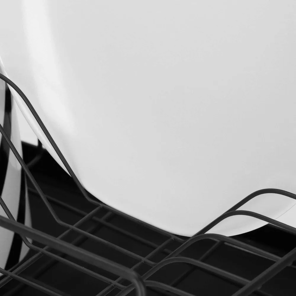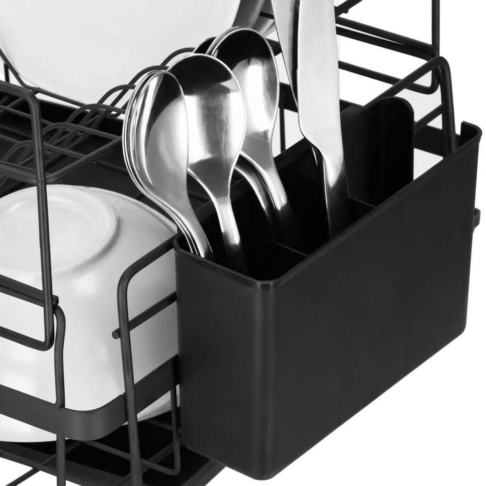Odkvapkávač na riad ponúka viacúrovňové sušenie vďaka praktickému dvojposchodovému prevedeniu. Nerezový odkvapkávač s podnosom z matnej ocele s čiernym práškovým nástrekom zaujme luxusným dizajnom. Odnímateľný plastový podnos zachytáva vodu, zatiaľ čo plastová priehradka na príbory a poschodie na taniere a misky uľahčujú organizáciu. Odkvapkávač sa ľahko čistí a poskytuje veľkú kapacitu.
