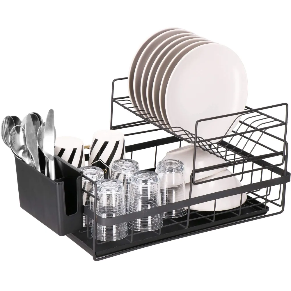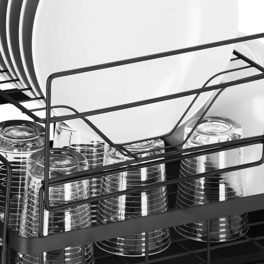 Vďaka dvojposchodovému prevedeniu ponúka dostatok priestoru pre taniere, misky, poháre i príbory, pričom využíva vertikálne usporiadanie na úsporu miesta. Konštrukcia z matnej ocele s čiernym práškovým nástrekom dodáva moderný vzhľad a zaisťuje odolnosť proti vlhkosti a korózii. Nerezový odkvapkávač s podnosom je doplnený o odnímateľný plastový podnos , ktorý zachytáva prebytočnú vodu a uľahčuje čistenie.
