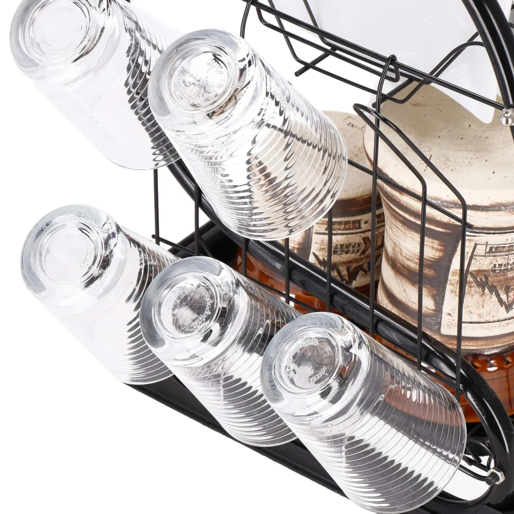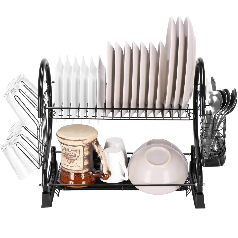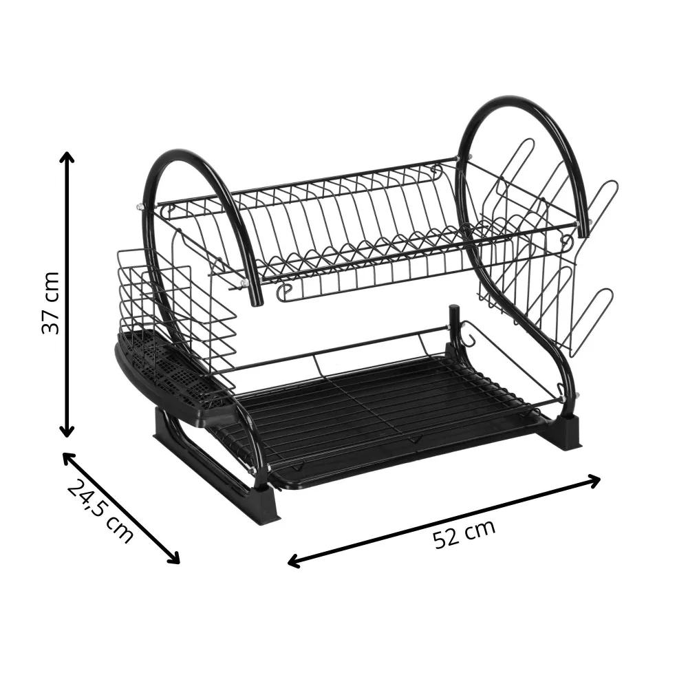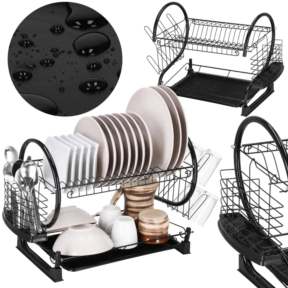 Vďaka dvojposchodovému prevedeniu ponúka dostatok priestoru pre taniere, misky, poháre i príbory, pričom využíva vertikálne usporiadanie na úsporu miesta. Konštrukcia z lesklej ocele s čiernym práškovým nástrekom dodáva moderný vzhľad a zaisťuje odolnosť proti vlhkosti a korózii. Nerezový odkvapkávač s podnosom je doplnený o odnímateľný plastový podnos , ktorý zachytáva prebytočnú vodu a uľahčuje čistenie.
