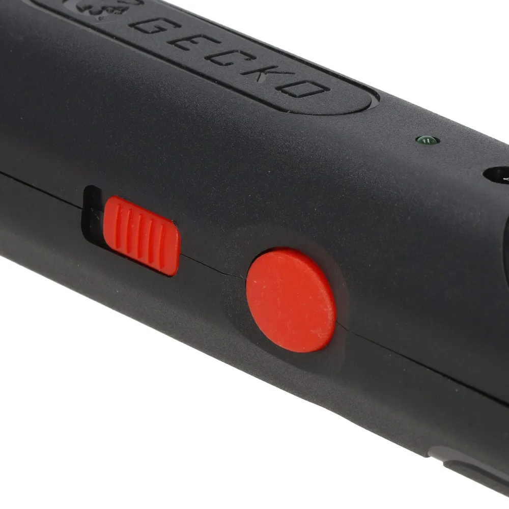 Červené tlačidlo súčasne plní funkciu bezpečnostnej pojitky. Pokiaľ nie je stlačené, k výboju nedôjde.