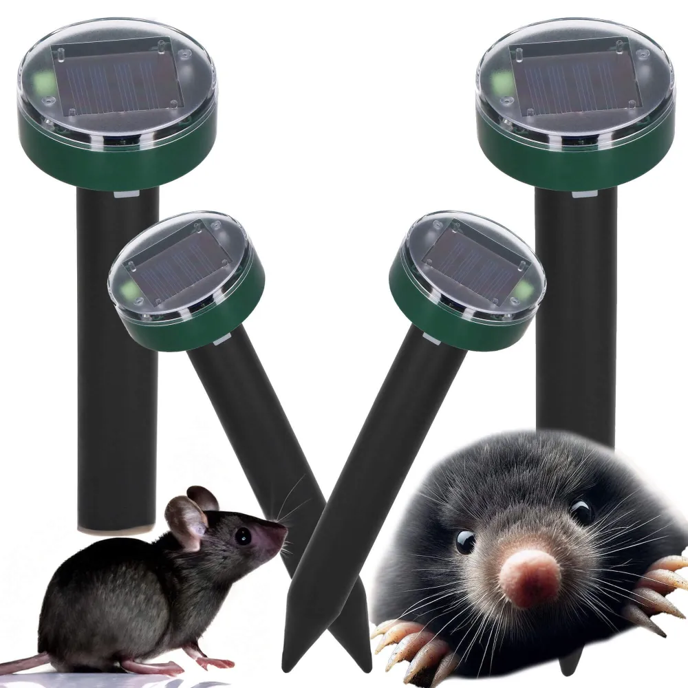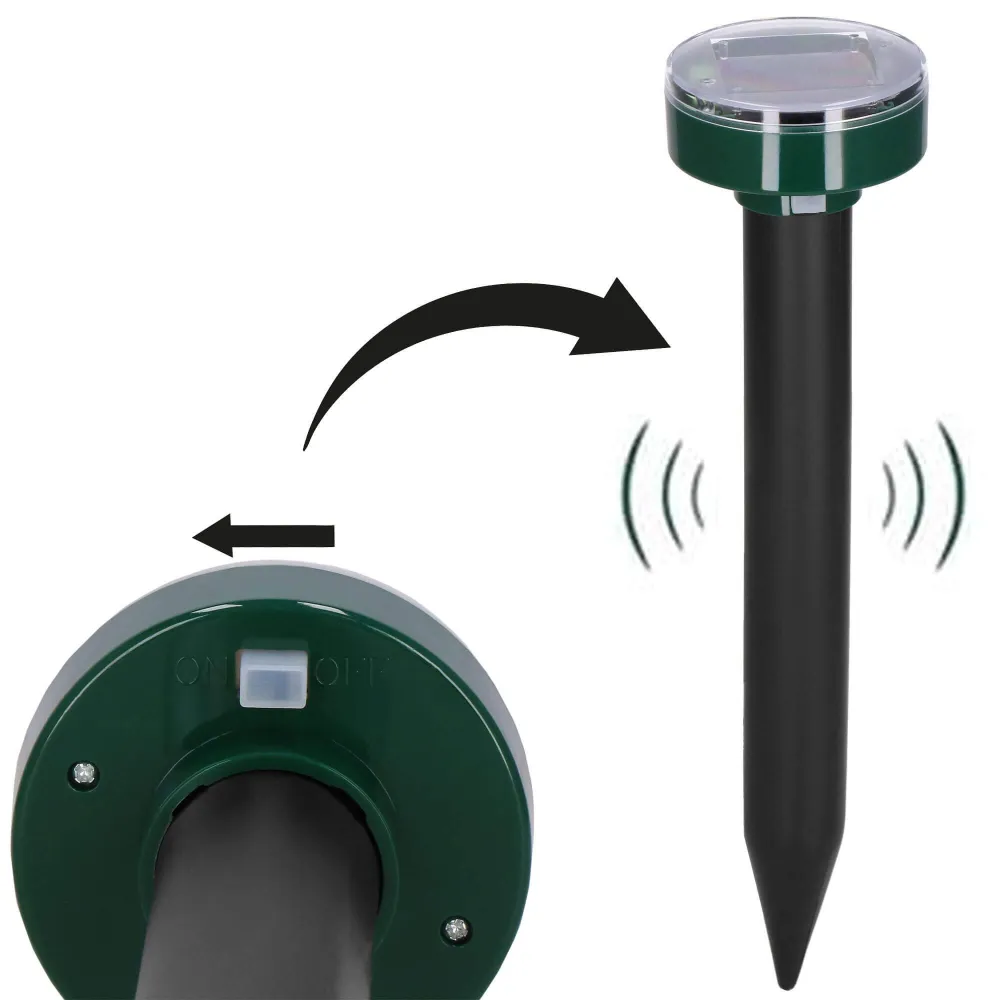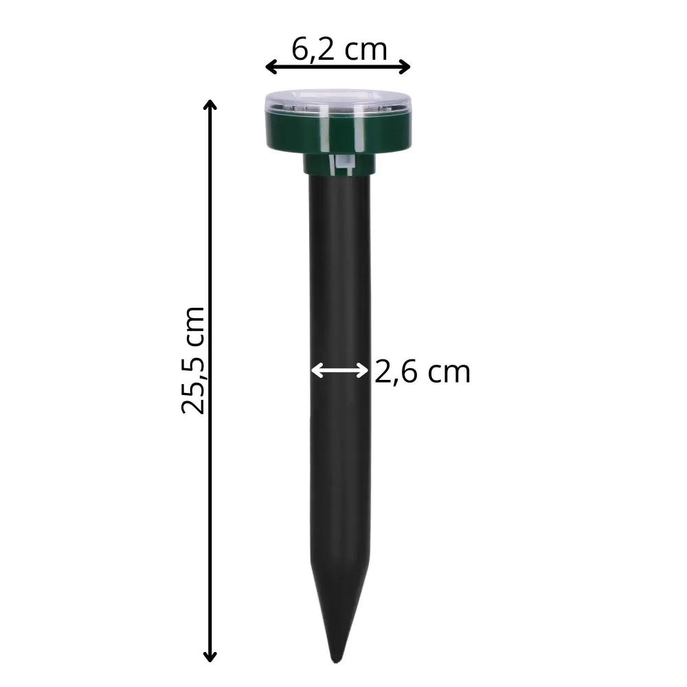 Sada 4 solárnych plašičov krtkov účinne odpudzuje krtko a hraboša pomocou vibrácií a vysokofrekvenčných zvukov, ktoré im prekážajú, ale neškodia. Vďaka solárnemu panelu nepotrebujú napájanie a vstavaná batéria zaistí prevádzku aj v noci. Sú vhodné na vonkajšie použitie za každého počasia. Bezpečné pre deti i domácich miláčikov. Spoľahlivo ochráni vašu záhradu pred krtkami, myšami, hrabošmi, krysami, kunami aj hady.