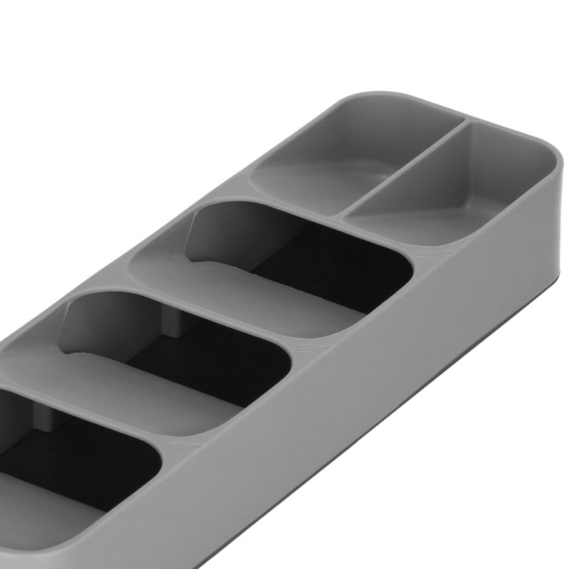 Kompaktný plastový príborník s piatimi priehradkami. Možnosť umiestnenia do zásuvky alebo na kuchynskú linku. Protišmykové nožičky. Polovičná úspora miesta v porovnaní s klasickým príborníkom, vďaka ukladaniu príborov pod uhlom nad sebou.