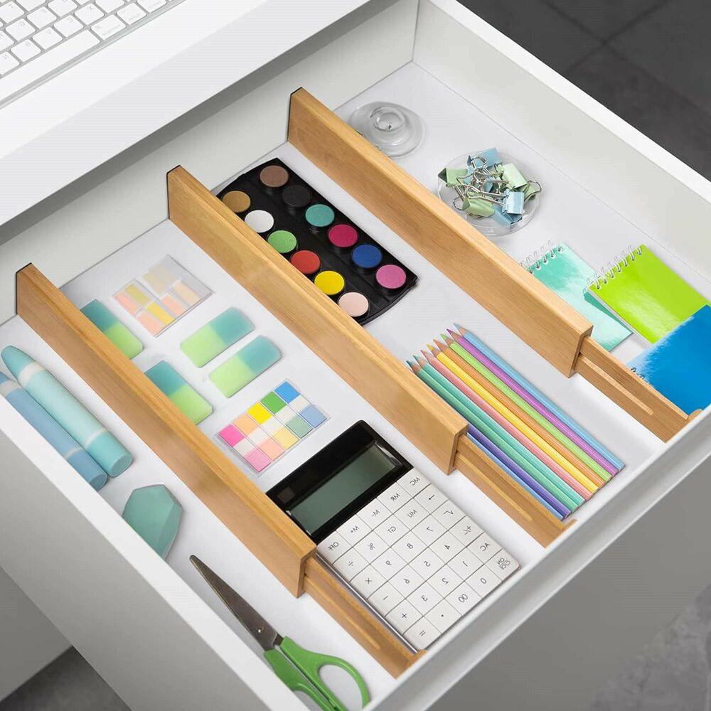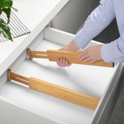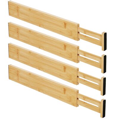 Oddeľovače do zásuviek z prírodného bambusu zaistia dokonalý poriadok v domácnosti. Vďaka nastaviteľnej konštrukcii sa ľahko prispôsobí rôznym veľkostiam šuplíkov. Čierne plstené podložky na každom konci rozdeľovača chránia nábytok a zabraňujú posunu. Súprava obsahuje štyri organizéry, ktoré vytvárajú praktické priehradky pre kuchynské náčinie, náradie alebo kancelárske potreby. Inštalácia je rýchla a jednoduchá. Maximálne rozpätie je 56,5 cm, minimálne 44,5 cm.