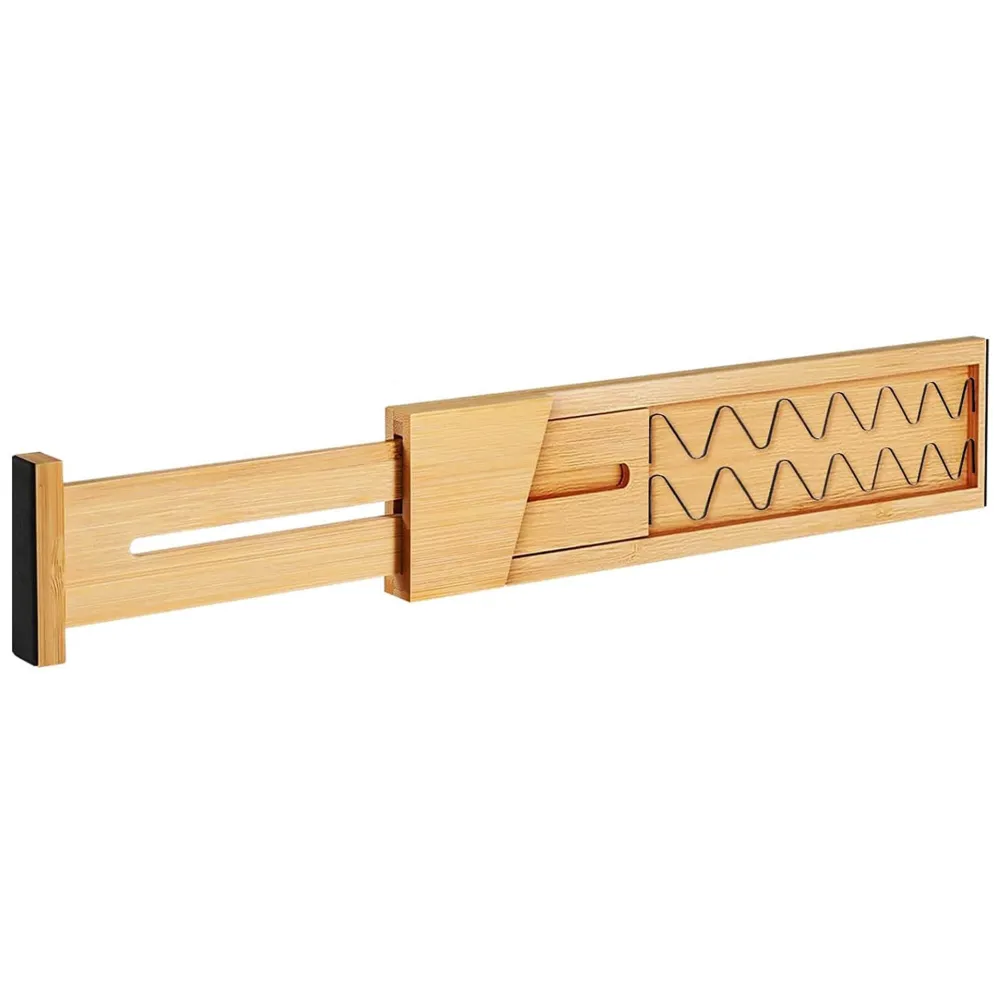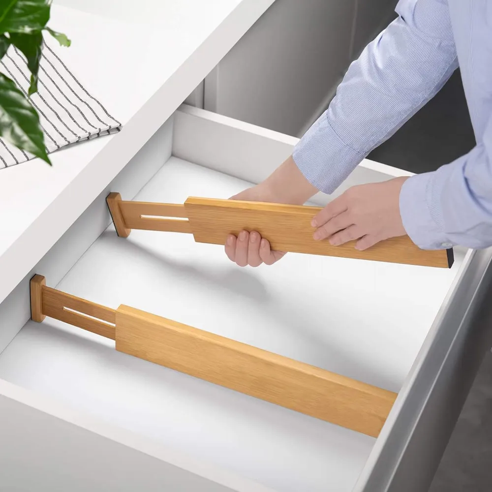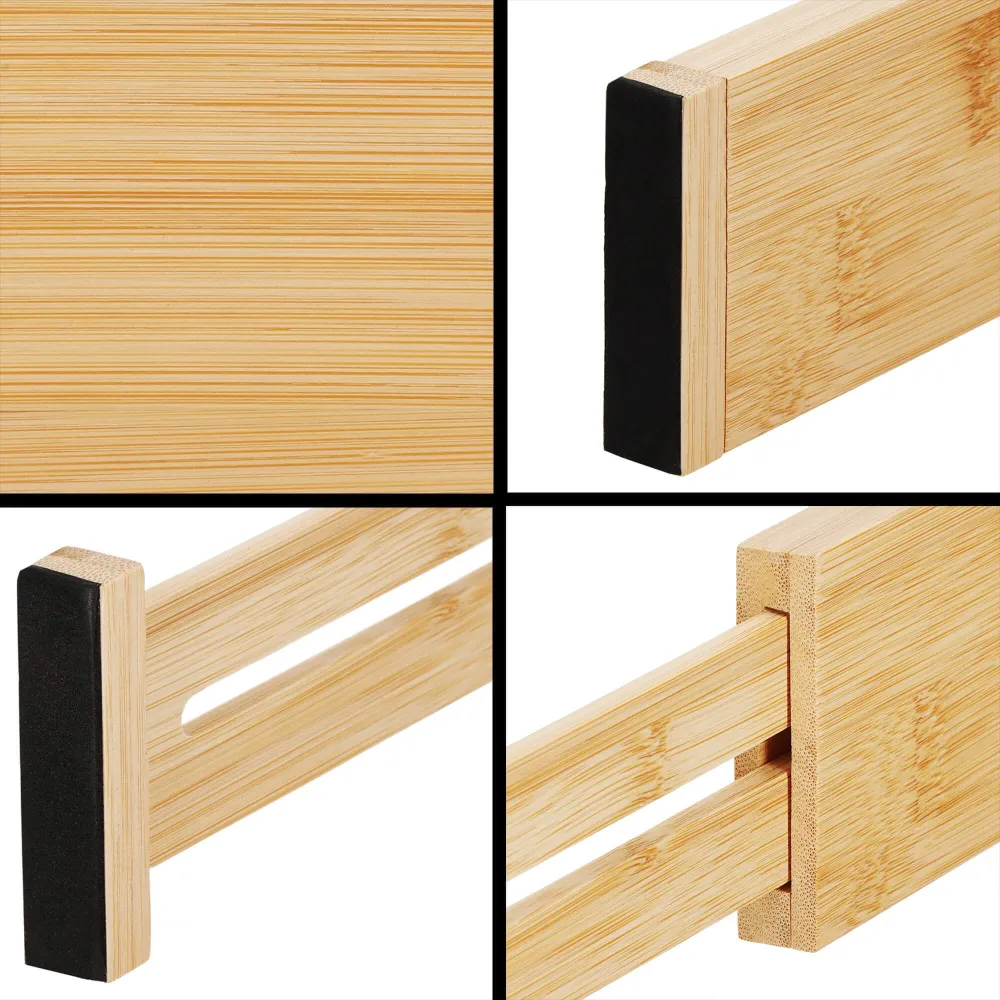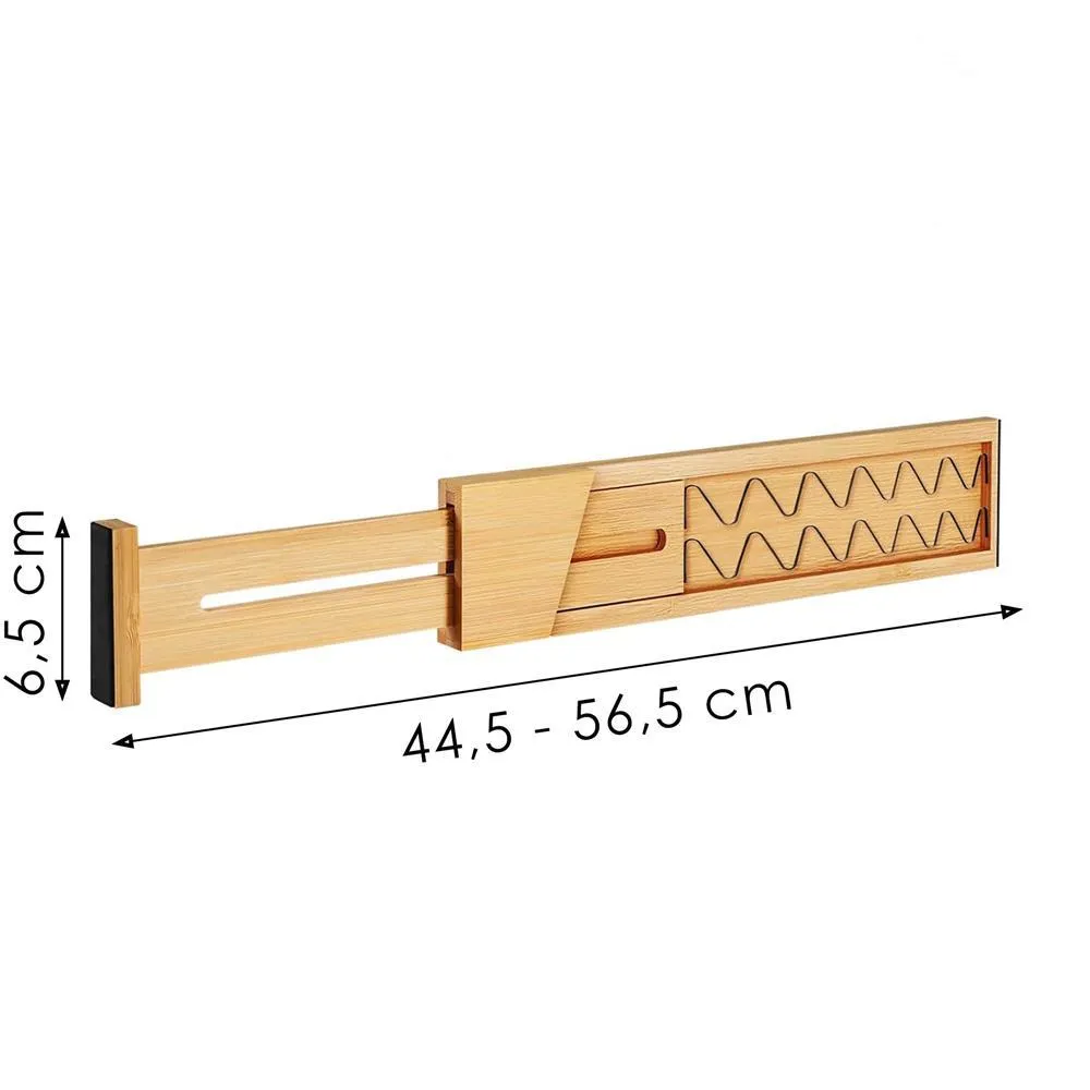 Oddeľovače do zásuviek z prírodného bambusu zaistia dokonalý poriadok v domácnosti. Vďaka nastaviteľnej konštrukcii sa ľahko prispôsobí rôznym veľkostiam šuplíkov. Čierne plstené podložky na každom konci rozdeľovača chránia nábytok a zabraňujú posunu. Súprava obsahuje štyri organizéry, ktoré vytvárajú praktické priehradky pre kuchynské náčinie, náradie alebo kancelárske potreby. Inštalácia je rýchla a jednoduchá. Maximálne rozpätie je 56,5 cm, minimálne 44,5 cm.