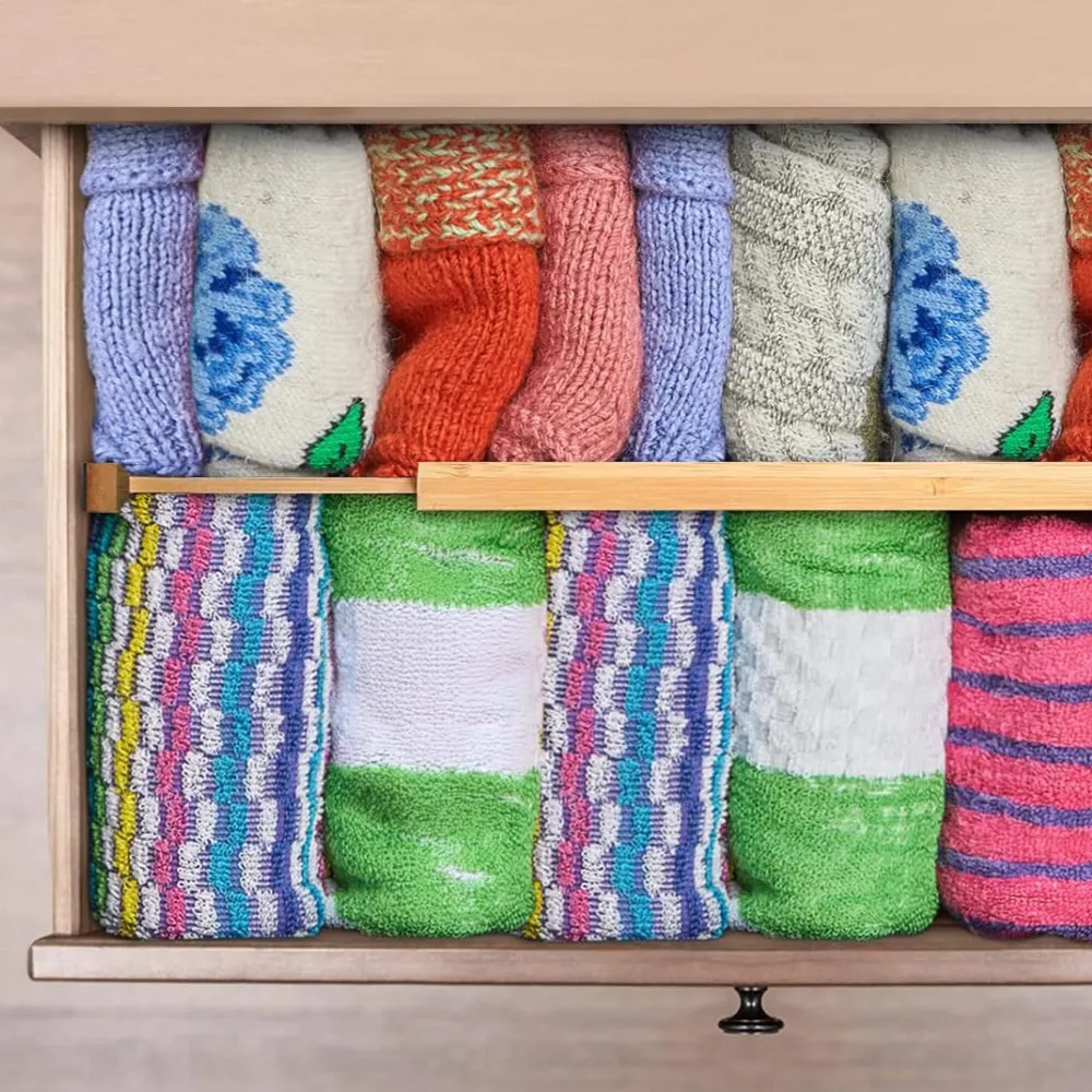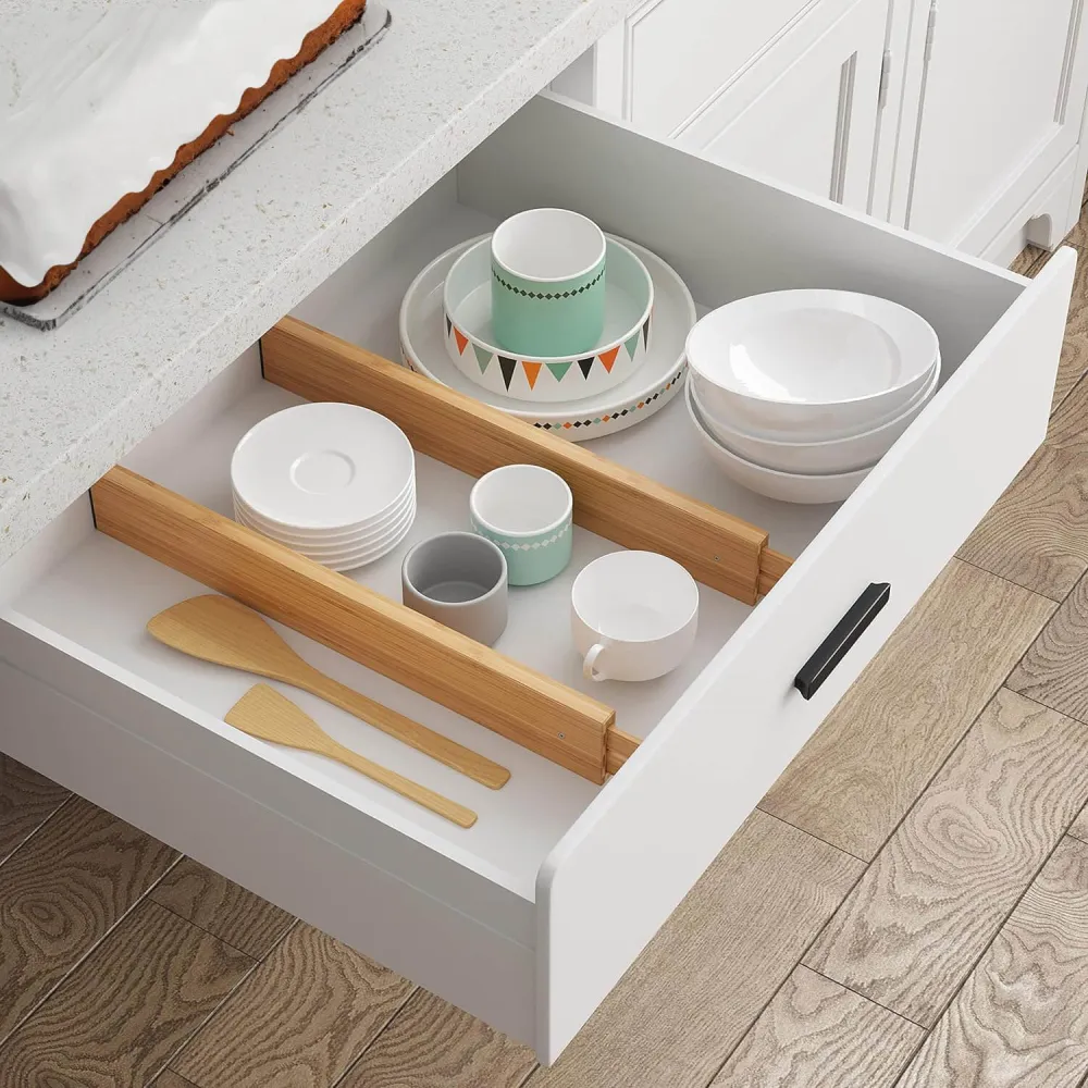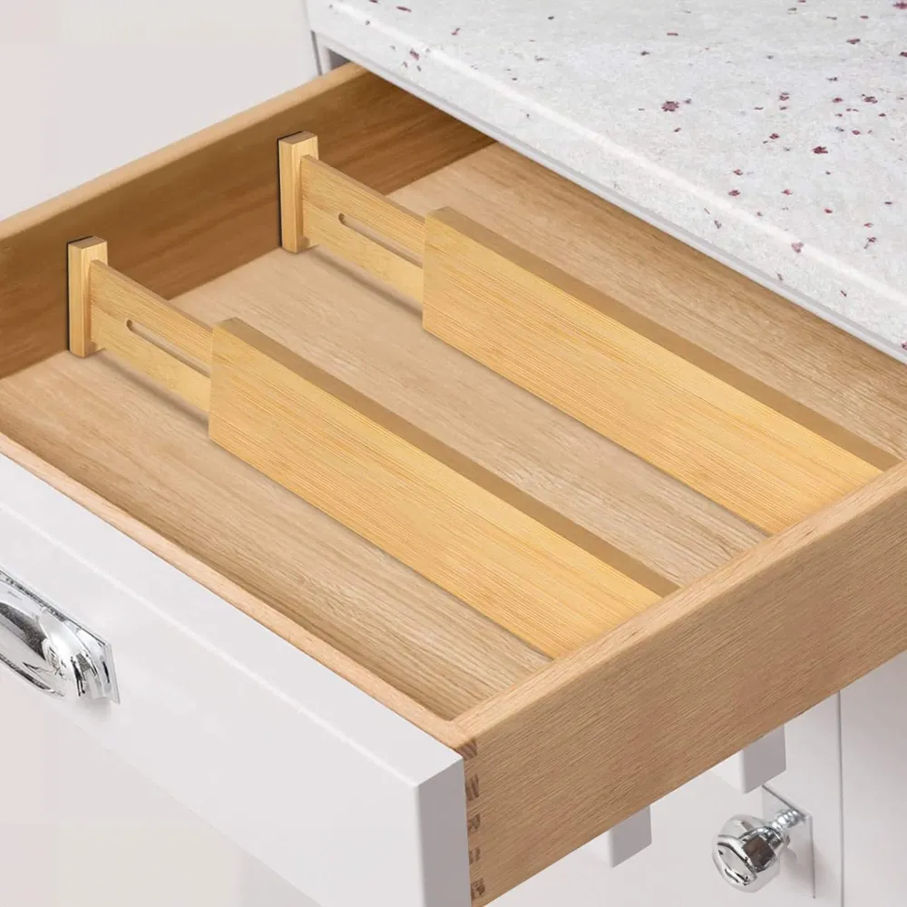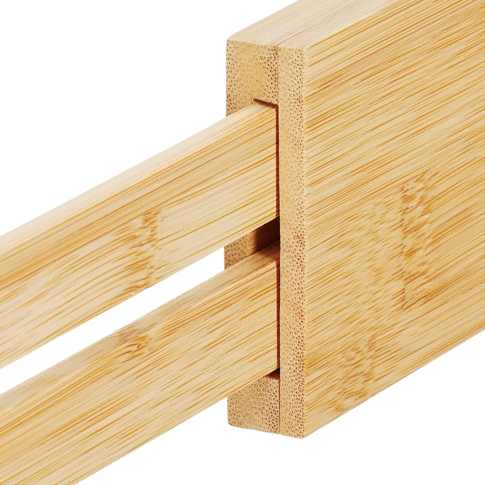 Oddeľovače do zásuviek z prírodného bambusu zaistia dokonalý poriadok v domácnosti. Vďaka nastaviteľnej konštrukcii sa ľahko prispôsobí rôznym veľkostiam šuplíkov. Čierne plstené podložky na každom konci rozdeľovača chránia nábytok a zabraňujú posunu. Súprava obsahuje štyri organizéry, ktoré vytvárajú praktické priehradky pre kuchynské náčinie, náradie alebo kancelárske potreby. Inštalácia je rýchla a jednoduchá. Maximálne rozpätie je 56,5 cm, minimálne 44,5 cm.