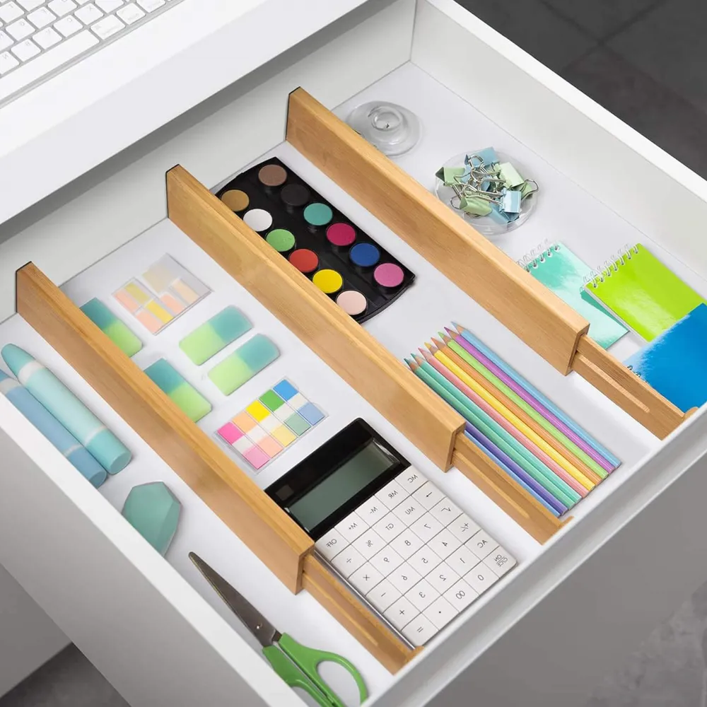 Rozdeľovače do zásuviek nastaviteľné SPRINGOS KI0151 bambus sada 4 ks predstavujú praktické a elegantné riešenie pre organizáciu priestoru v zásuvkách . Vďaka nastaviteľnej konštrukcii sa ľahko prispôsobí rôznym veľkostiam šuplíkov, čo umožňuje vytvoriť prehľadné priehradky presne podľa vašich potrieb.