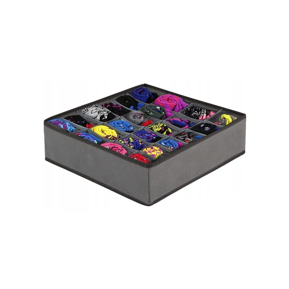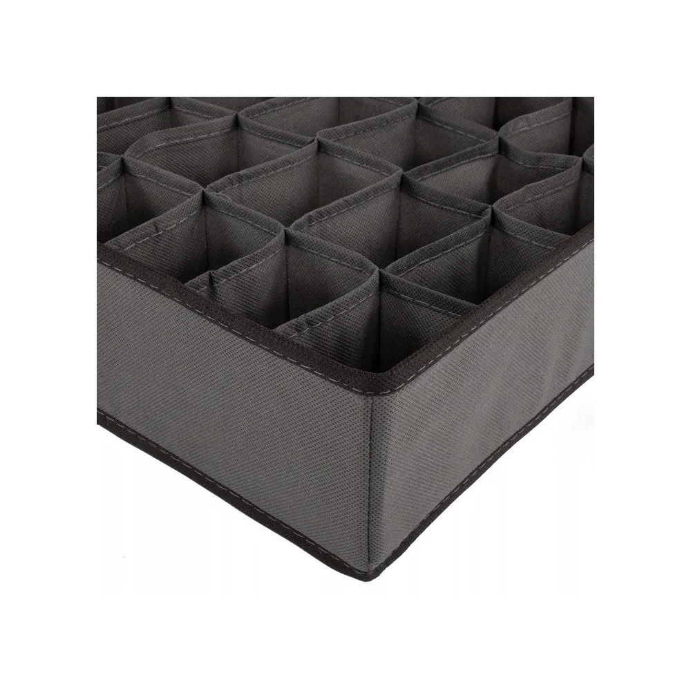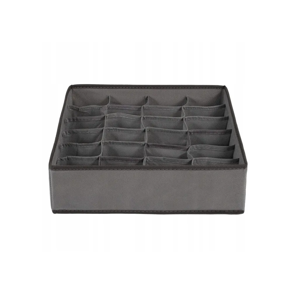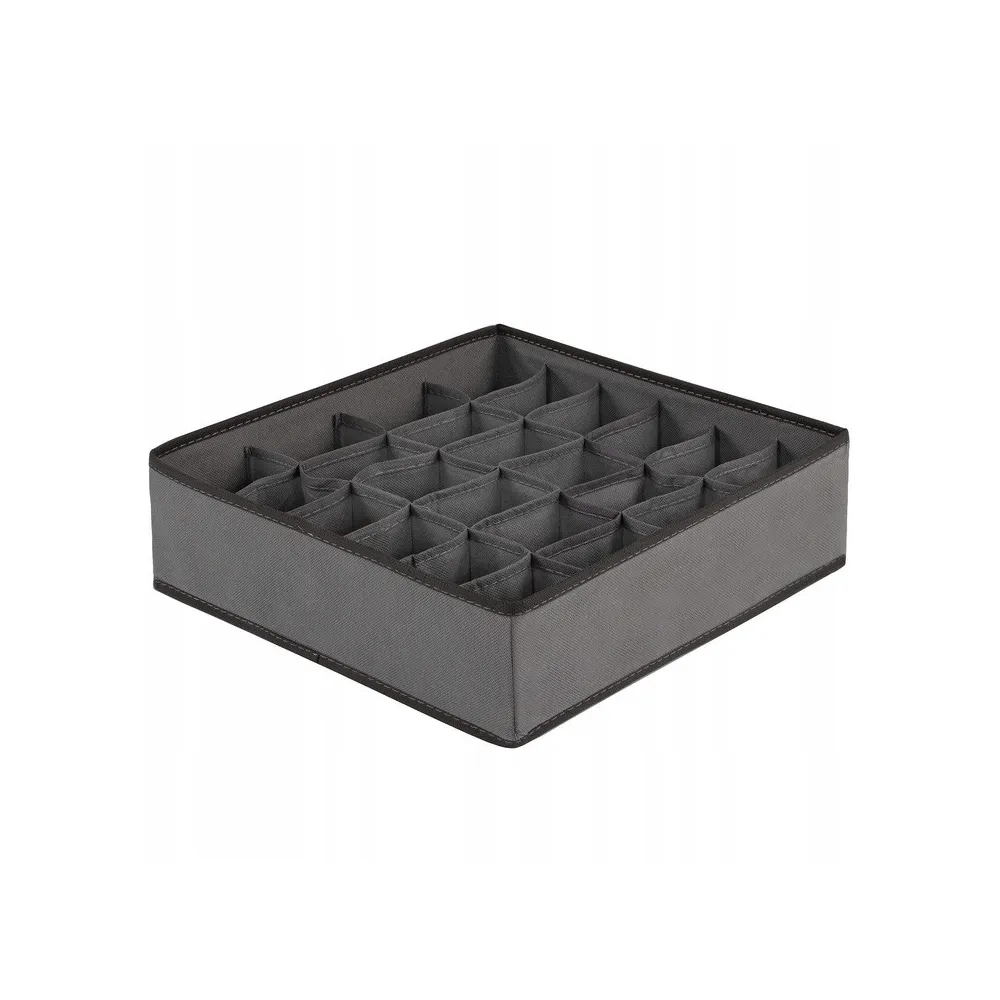 Praktický textilný organizér do šuplíka s 24 samostatnými oddielmi. Vhodný na uloženie spodnej bielizne, ponožiek, kozmetiky a ďalších drobných vecí. Kompaktné skladacie prevedenie so zosilnenými bokmi. Rozmery 33x33x10 cm.