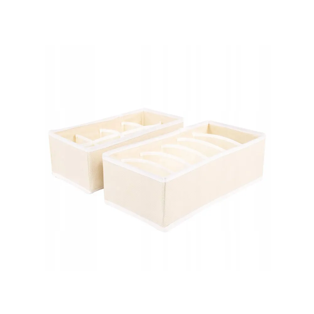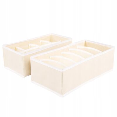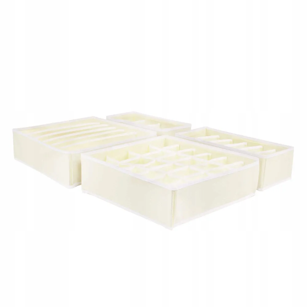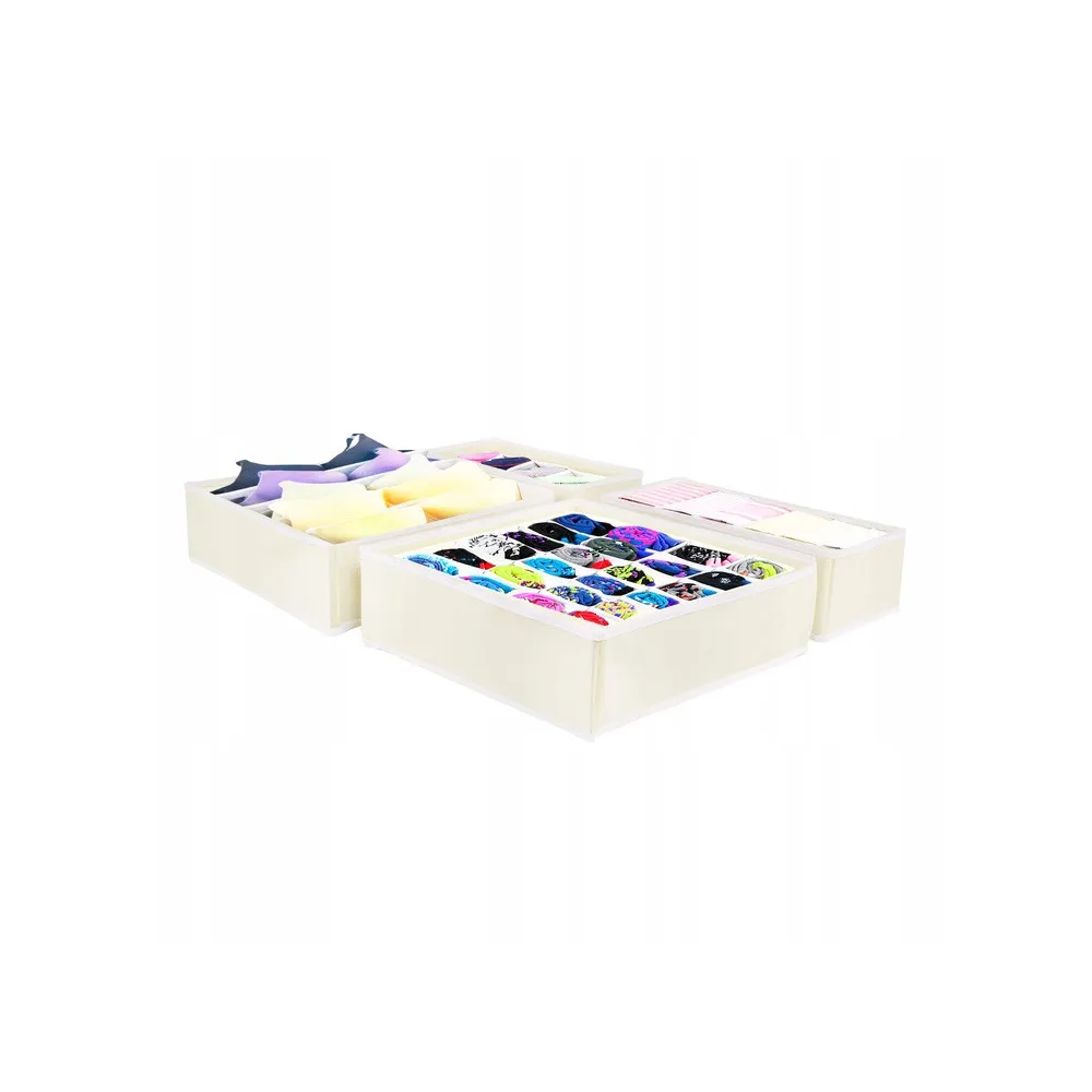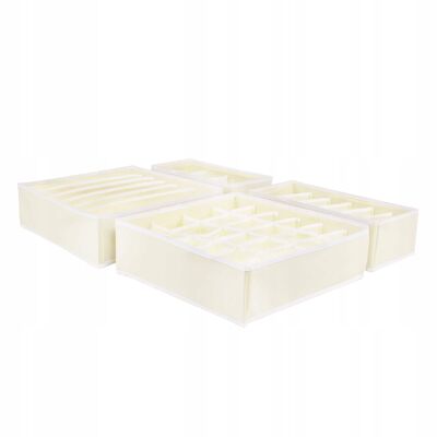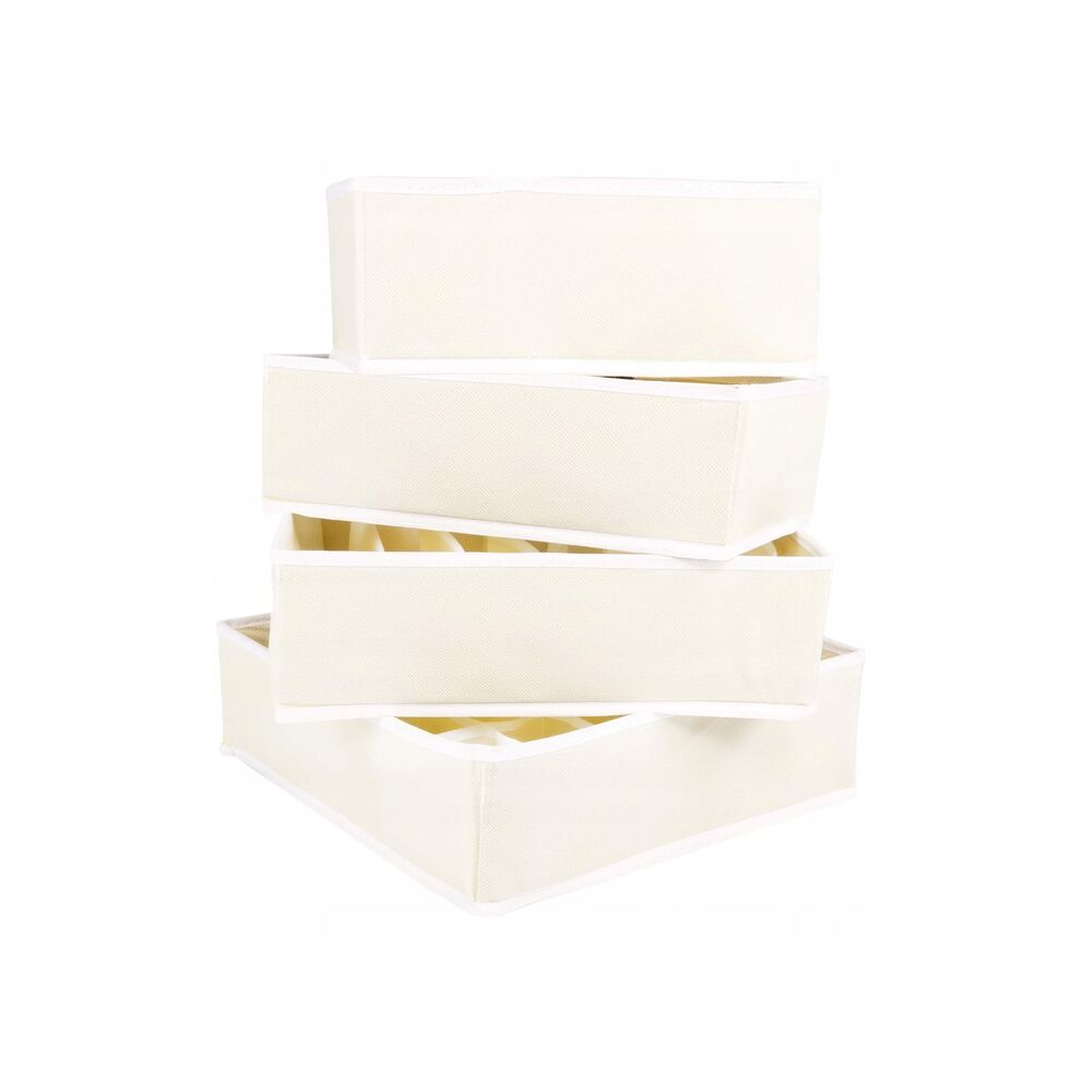 Výhodná sada 4ks praktických organizérov obsahuje 2 väčšie a 2 menšie textilné boxy. Vhodné na uloženie spodnej bielizne, ponožiek, kozmetiky a ďalších vecí. Kompaktné skladacie prevedenie so zosilnenými bokmi.