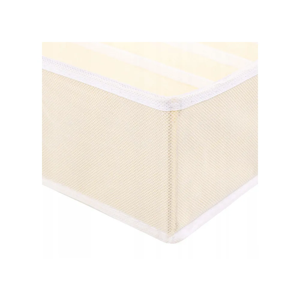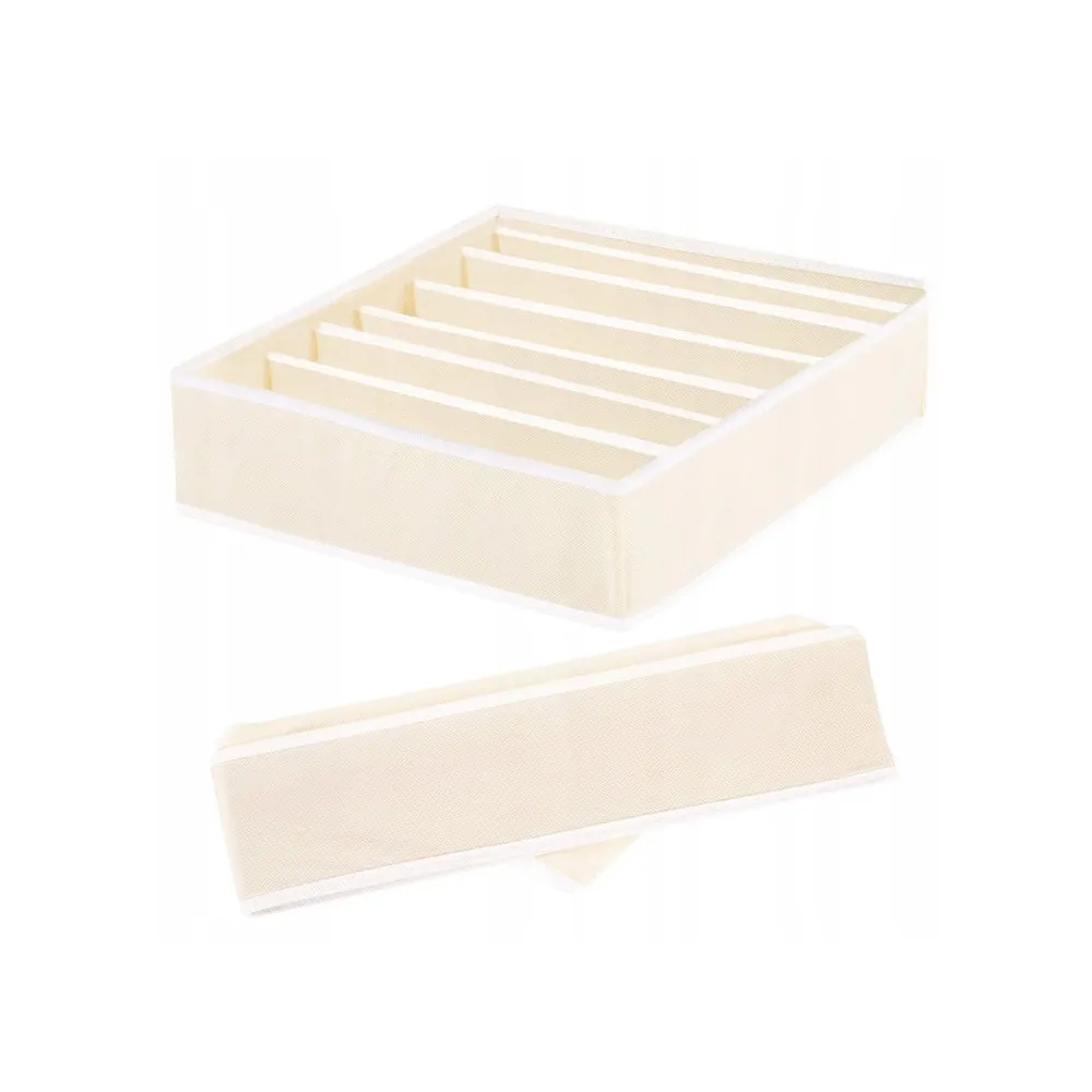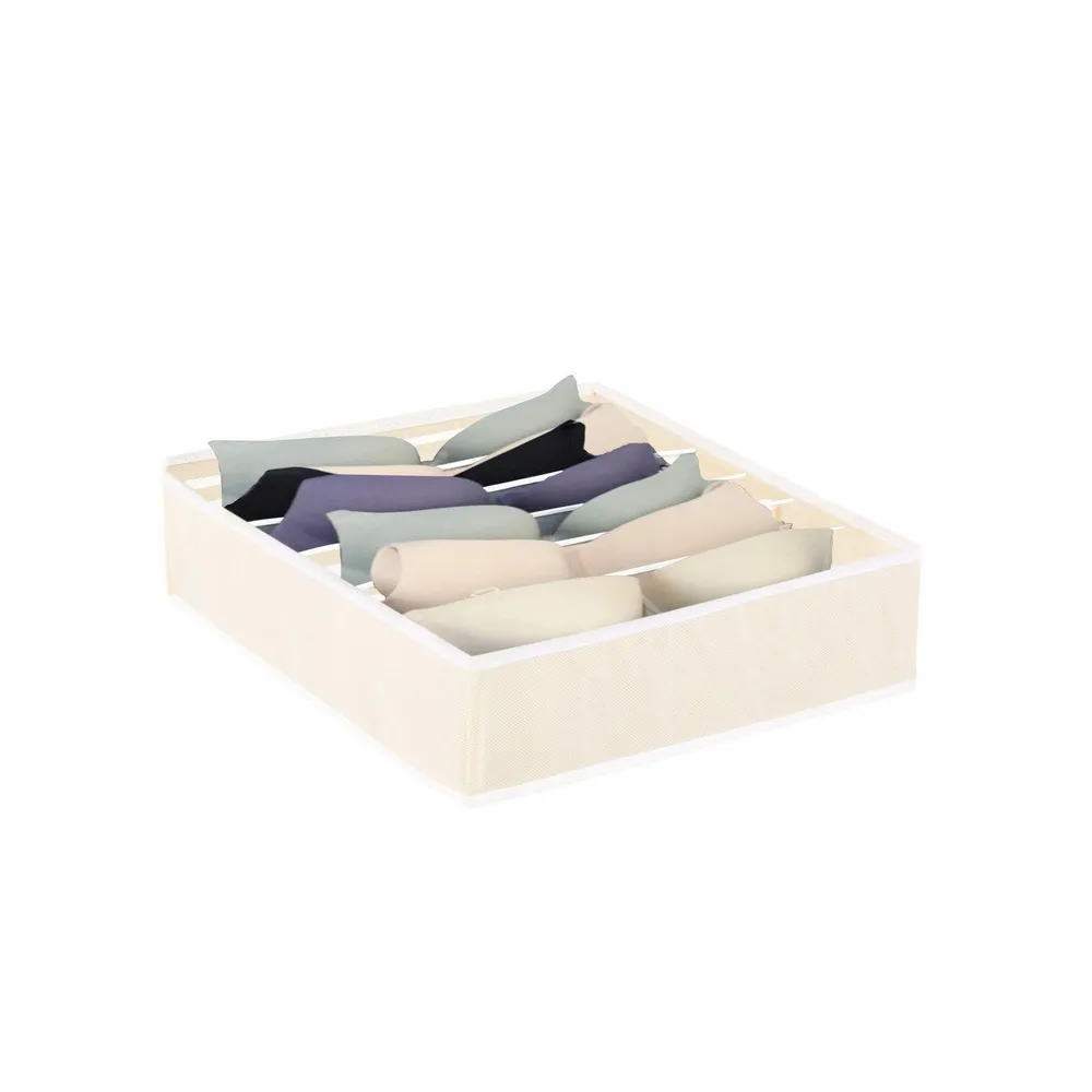 Praktický textilný organizér do šuplíka so 7 samostatnými oddielmi. Vhodný na uloženie podprseniek alebo iných častí spodnej bielizne, kozmetiky a ďalších vecí. Kompaktné skladacie prevedenie so zosilnenými bokmi. Rozmery 30x30x10 cm.
