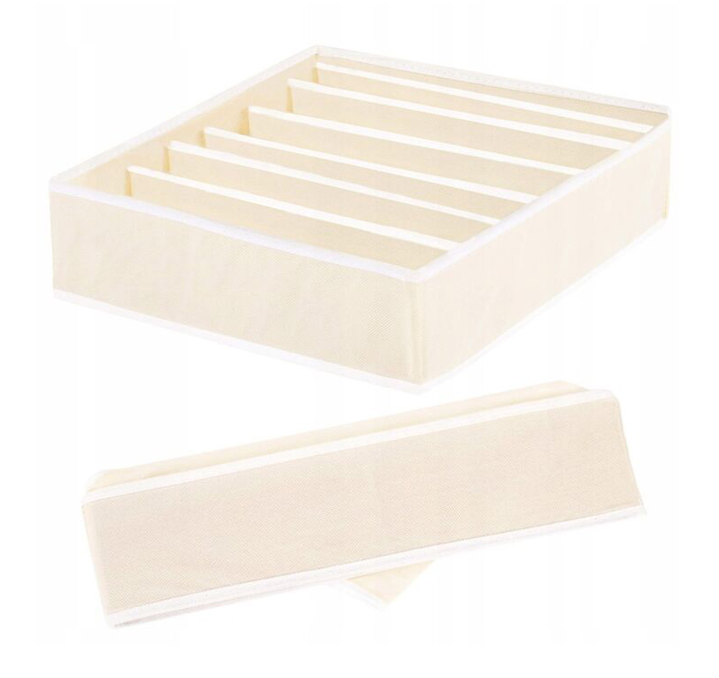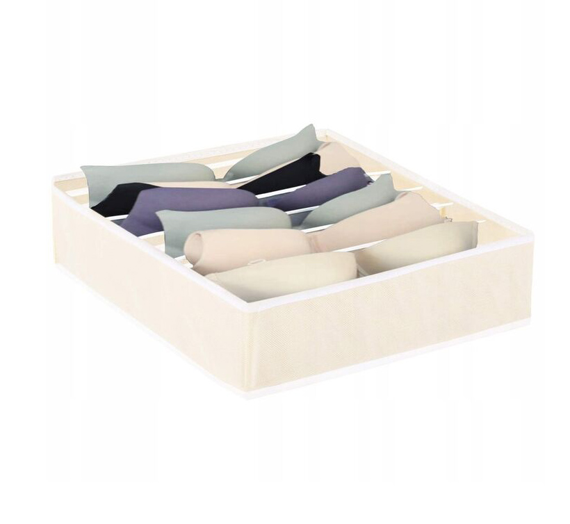 Praktický textilný organizér do šuplíka so 7 samostatnými oddielmi. Vhodný na uloženie podprseniek alebo iných častí spodnej bielizne, kozmetiky a ďalších vecí. Kompaktné skladacie prevedenie so zosilnenými bokmi. Rozmery 30x30x10 cm.