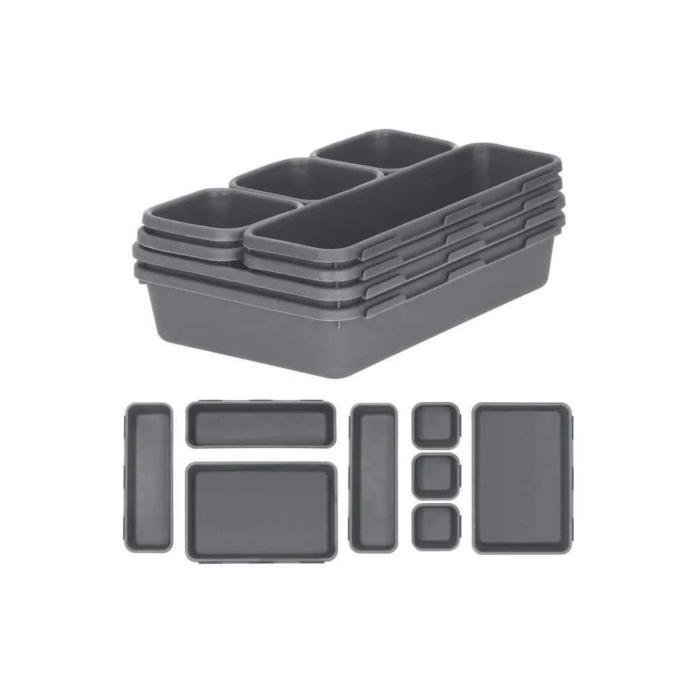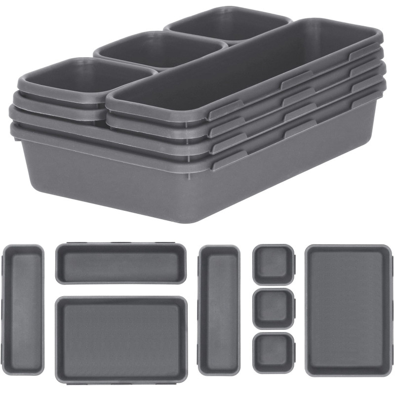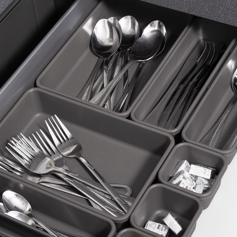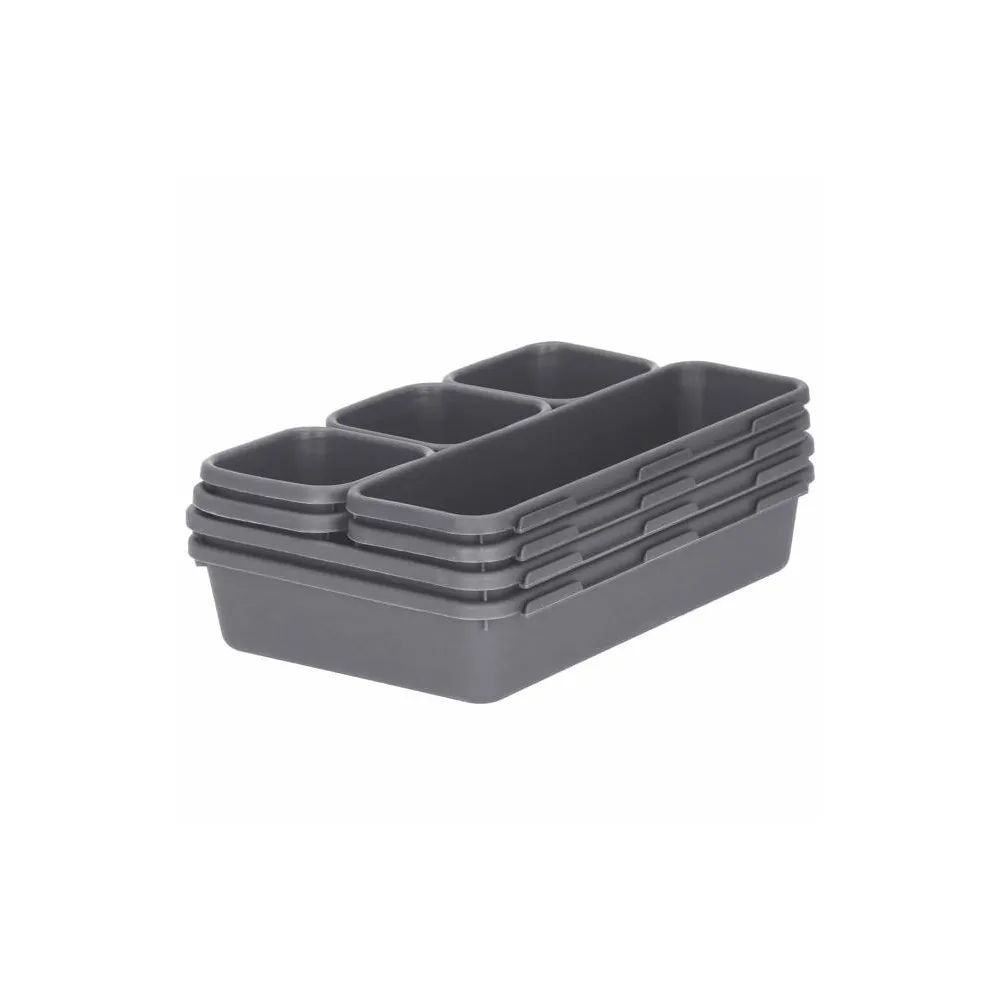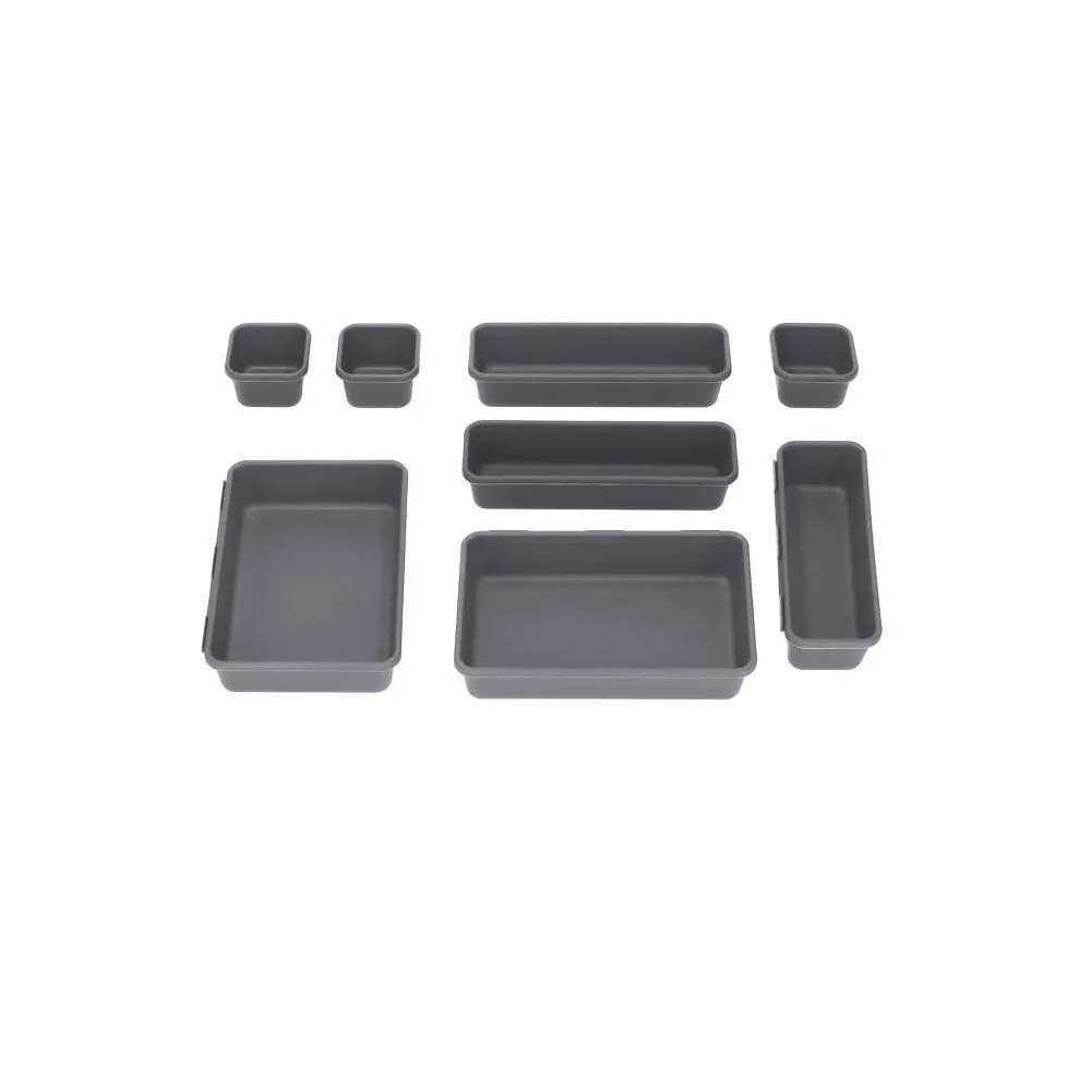 Súprava 8ks rôzne veľkých plastových organizérov s postranným zámkom. Nespočet možných zoskupení, kompaktné spojenie pomocou zámkov, pevnej steny z kvalitného plastu. Veľkosť boxov S/M/L, set v šedej farbe.