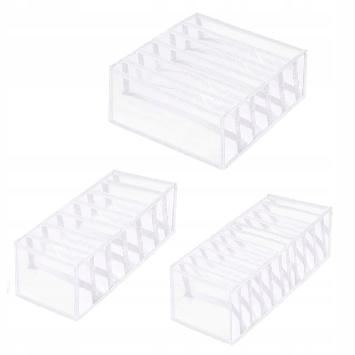 Výhodná sada 3ks nylonových organizérov obsahuje jeden väčší a dva menšie textilné boxy. Perfektný na uloženie podprseniek alebo iných častí spodnej bielizne.