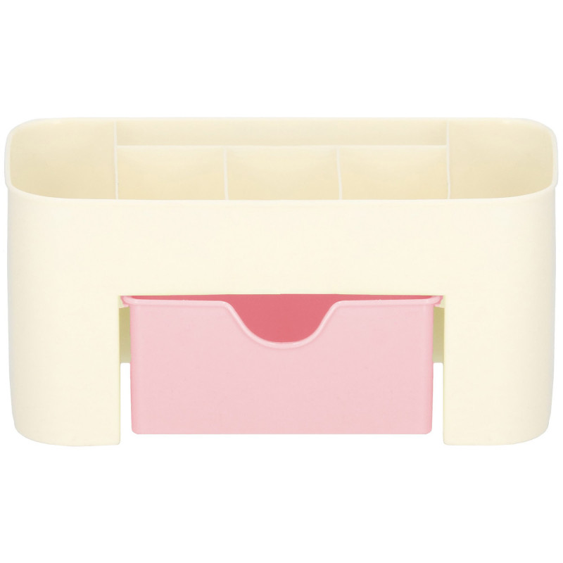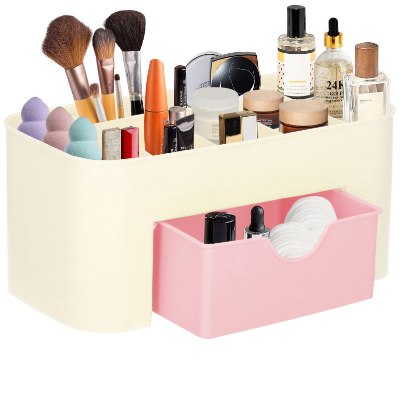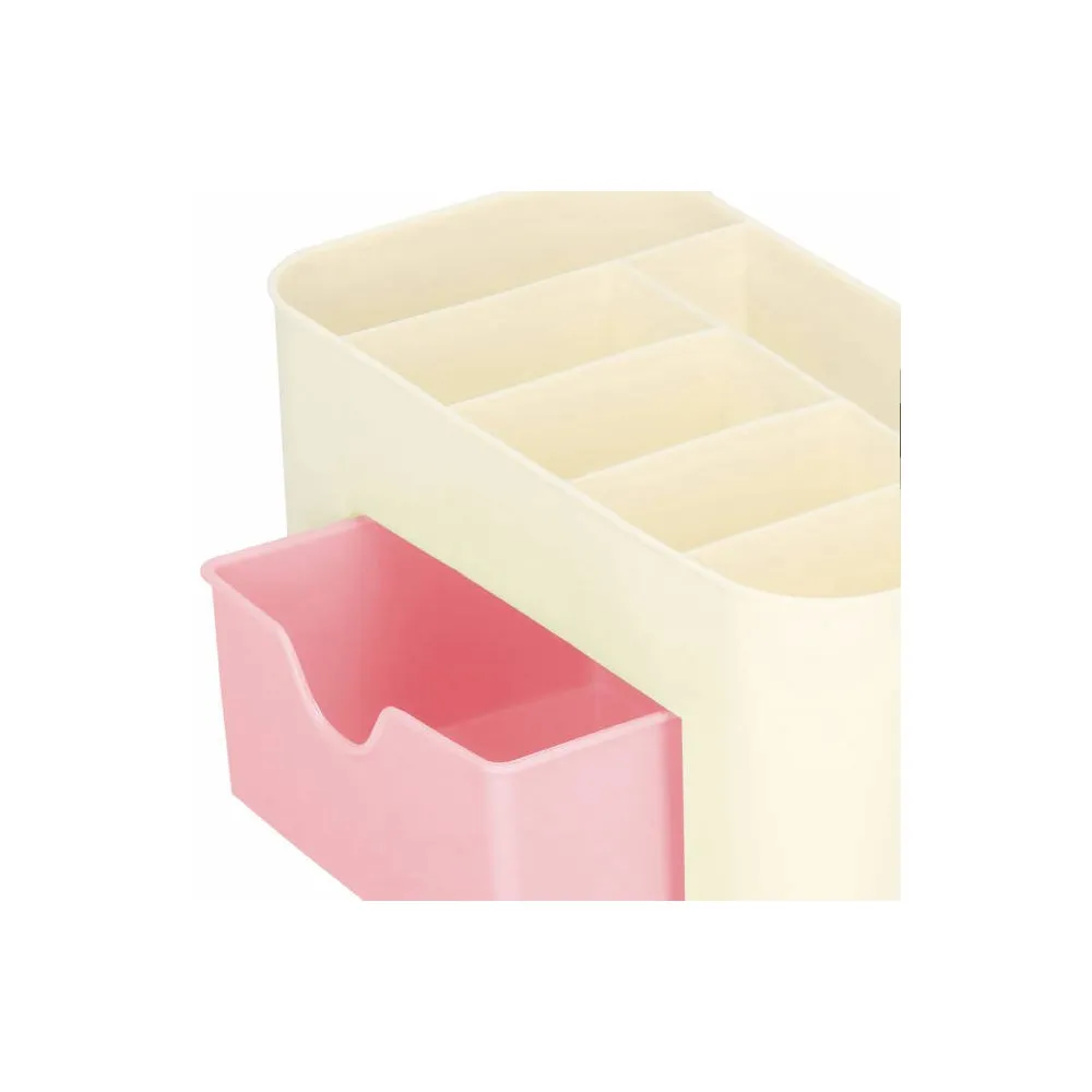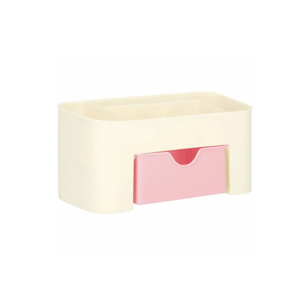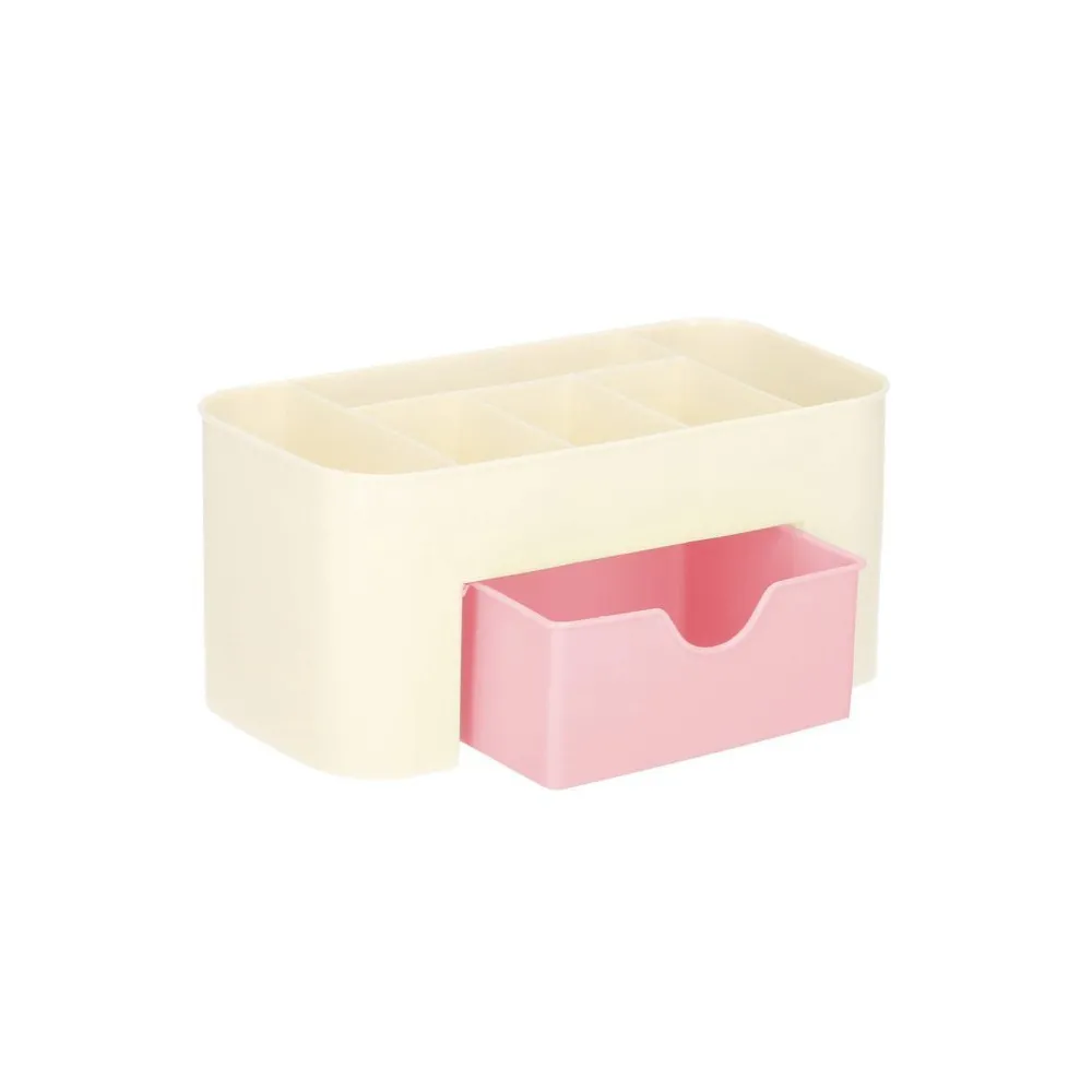 Organizér so zásuvkou na kozmetické prípravky a šperky. Obsahuje priestrannú výsuvnú zásuvku a šesť otvorených priehradok rôznej veľkosti. Rozmery 21x10x10 cm. Menšiu z priehradok využijete na ukladanie náušníc, prsteňov alebo lakov na nechty. Do tých väčších bočných sa ľahko zmestia štetce, parfémy alebo korečné ceruzky.