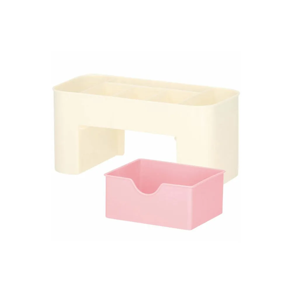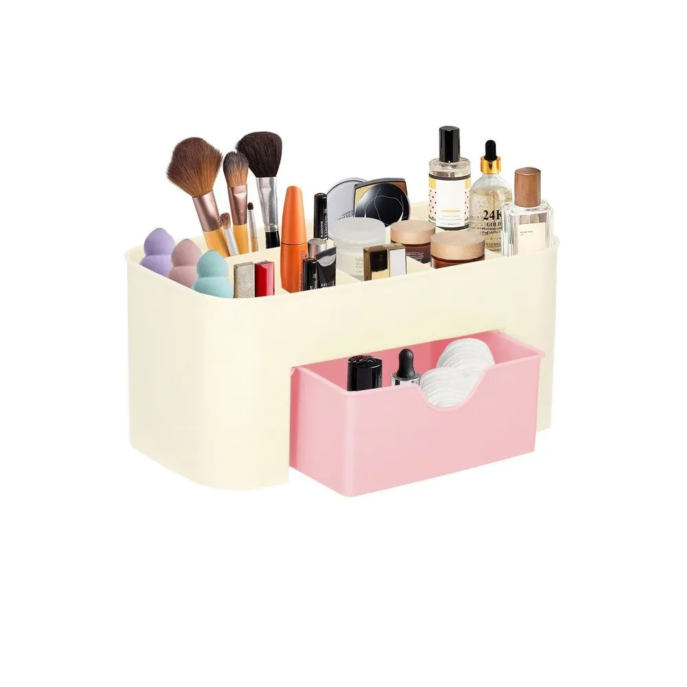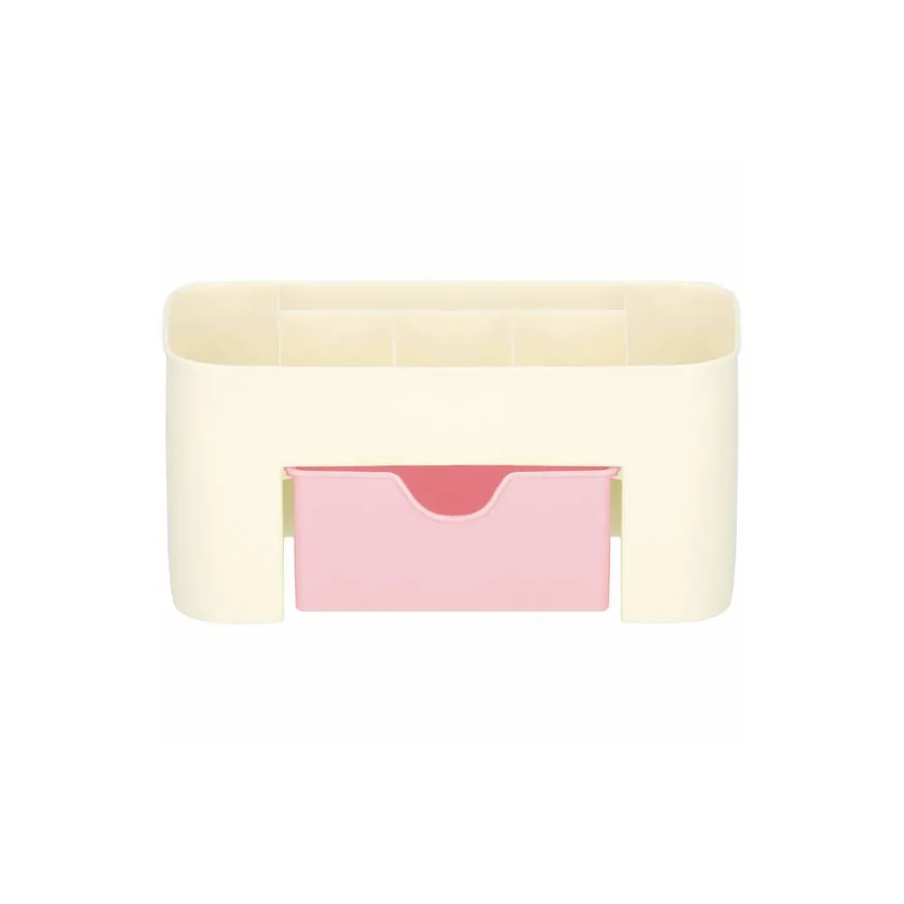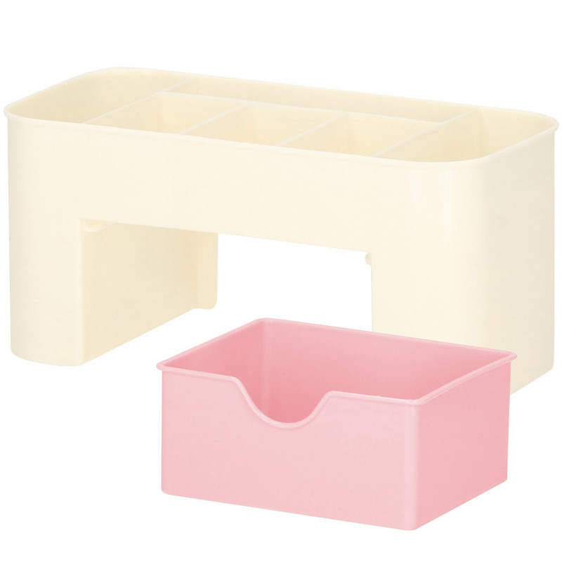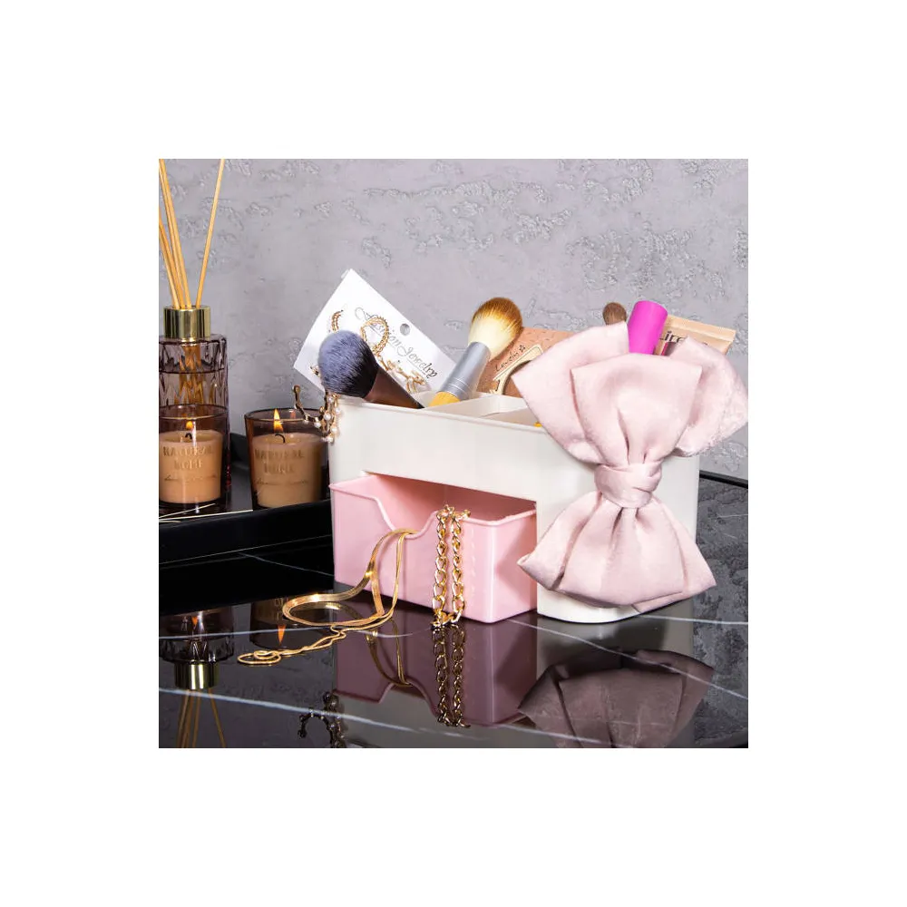Organizér so zásuvkou na kozmetické prípravky a šperky. Obsahuje priestrannú výsuvnú zásuvku a šesť otvorených priehradok rôznej veľkosti. Rozmery 21x10x10 cm. Menšiu z priehradok využijete na ukladanie náušníc, prsteňov alebo lakov na nechty. Do tých väčších bočných sa ľahko zmestia štetce, parfémy alebo korečné ceruzky.