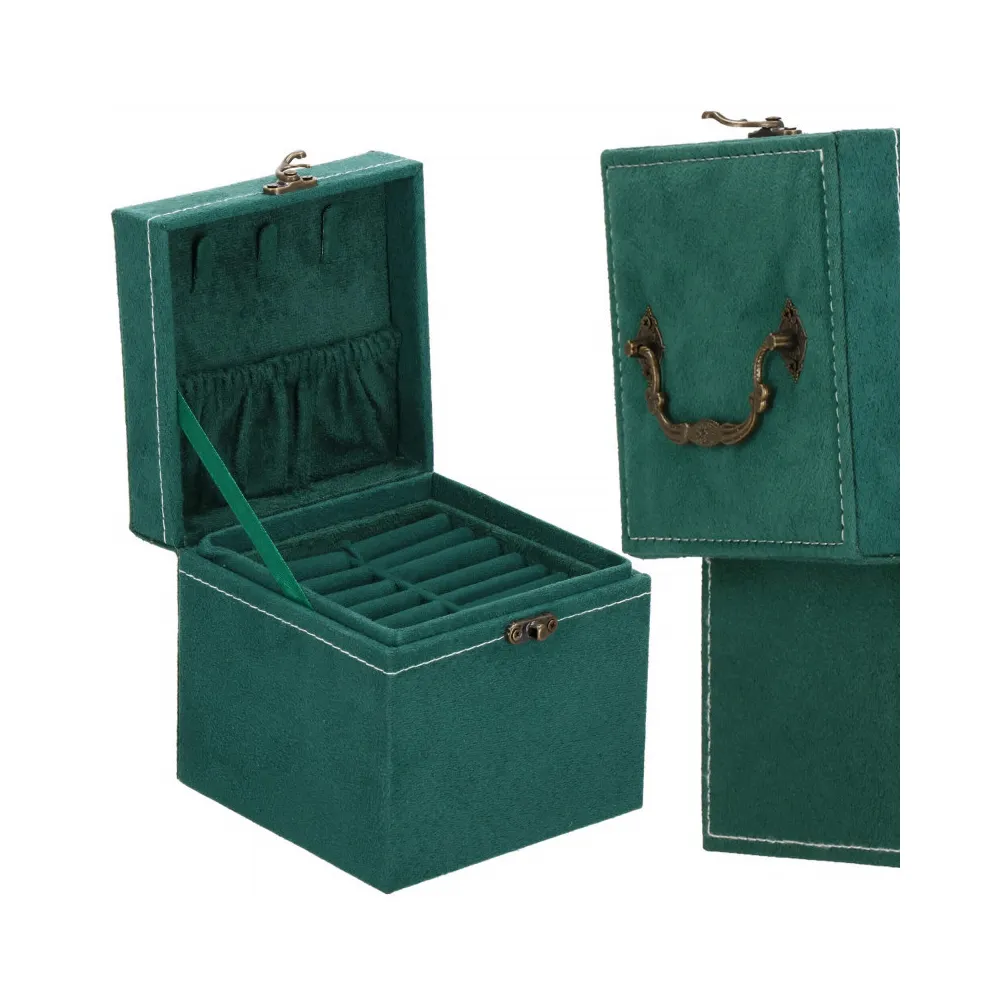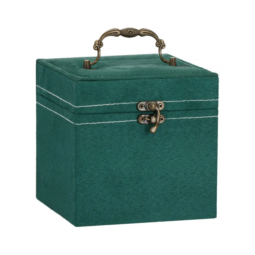 Šperkovnica Vám umožní pohodlné a bezpečné uloženie rôznych druhov prsteňov, retiazok, náramkov, brošní a ďalších doplnkov. Ponúkaný velúrový kufor obsahuje početné priehradky, v ktorých môžete triediť cenné predmety. Vložky premyslene na sebe, jedna z nich na uloženie prsteňov. Štýlovo zelený organizér je dokonale zladená so zlatým svorníkom a retro úchytom. Organizér je malý a skladný.
