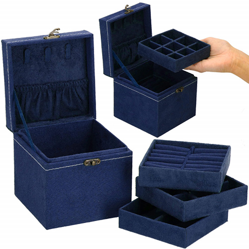Šperkovnica Vám umožní pohodlné a bezpečné uloženie rôznych druhov prsteňov, retiazok, náramkov, brošní a ďalších doplnkov. Ponúkaný velúrový kufor obsahuje početné priehradky, v ktorých môžete triediť cenné predmety. Vložky premyslene na sebe, jedna z nich na uloženie prsteňov. Štýlovo modrý organizér je dokonale zladená so zlatým svorníkom a retro úchytom. Organizér je malý a skladný.