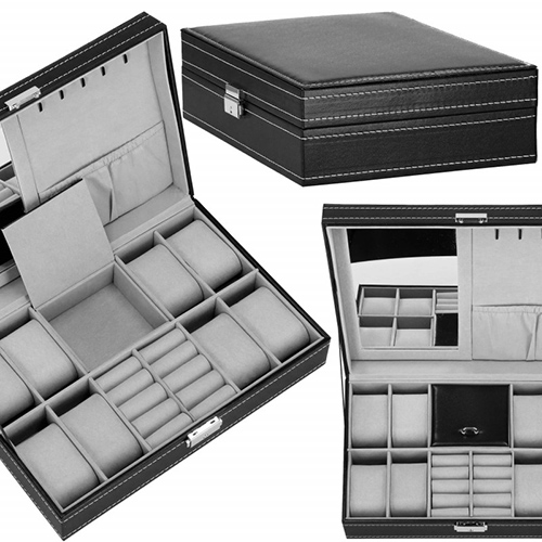 Ideálnym a stále populárnejším riešením na odkladanie cenností sú organizéry určené na hodinky, doplnky a šperky. Vyrobené s dôrazom na tie najmenšie detaily. Elegantné a praktické, kovové zatváranie. Organizér v podobe masívnej krabičky, vo vnútri je extrémne mäkká a na dotyk jemná velúrová látková podšívka. Rozmery puzdra sú 33 x 20 x 9 cm.