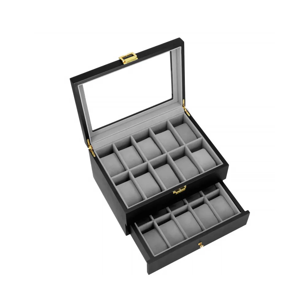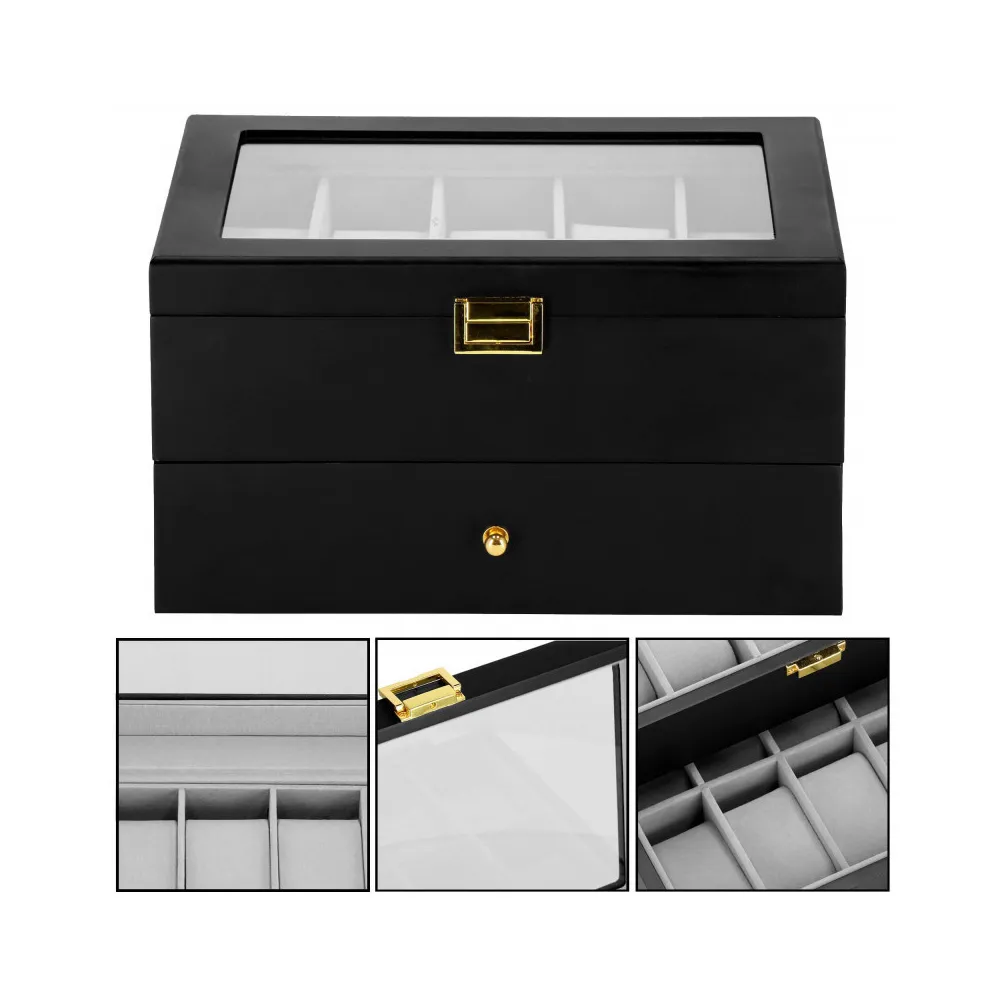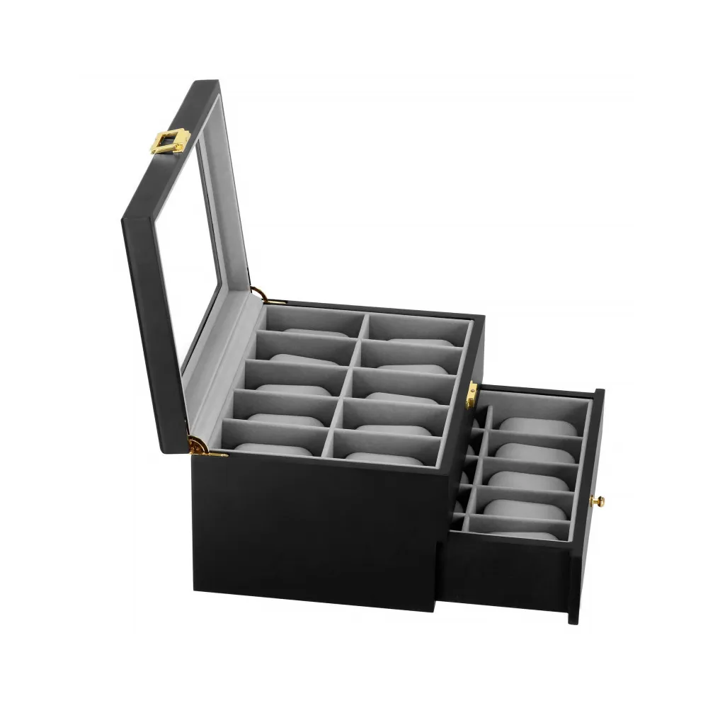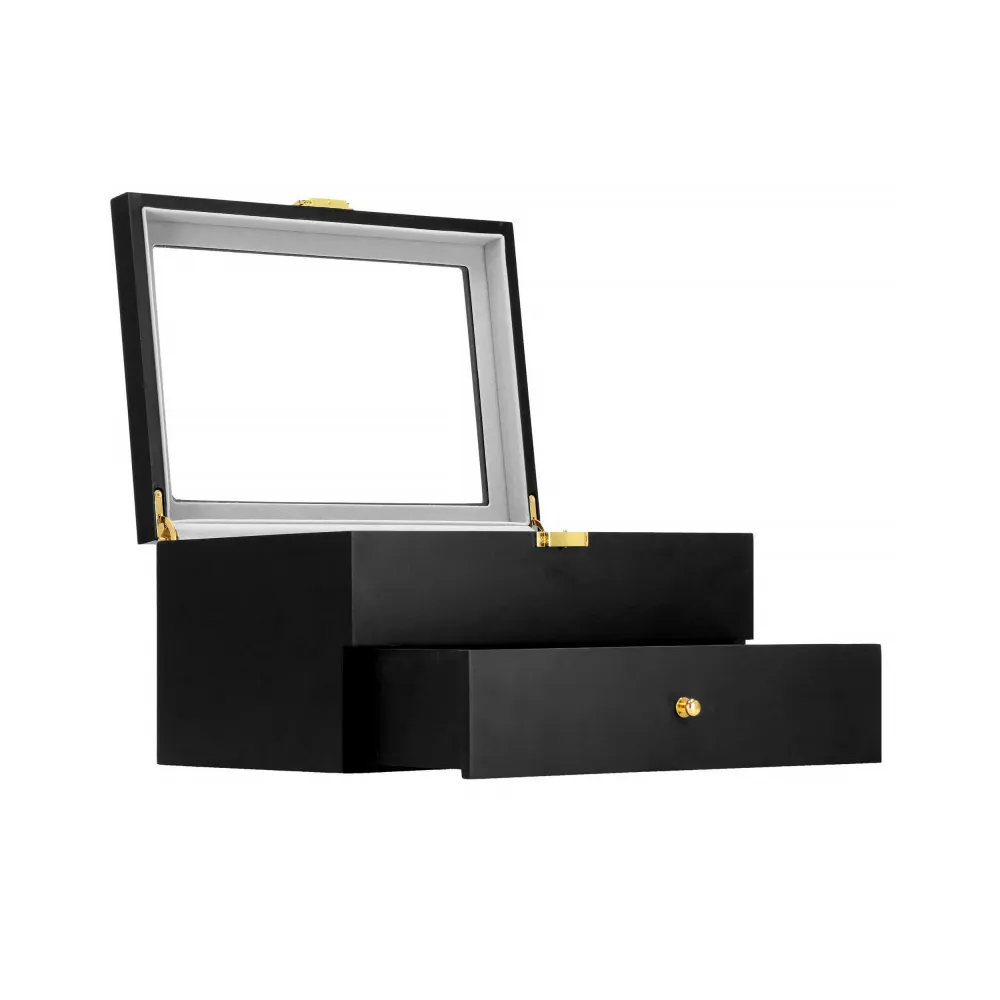 Ideálnym a stále populárnejším riešením na odkladanie cenností sú organizéry určené na hodinky, doplnky a šperky. Vyrobené s dôrazom na tie najmenšie detaily. Elegantné a praktické, kovové zatváranie. Organizér v podobe masívnej krabičky, vo vnútri je extrémne mäkká a na dotyk jemná velúrová látková podšívka. Rozmery 29 x 21 x 16,5 cm.