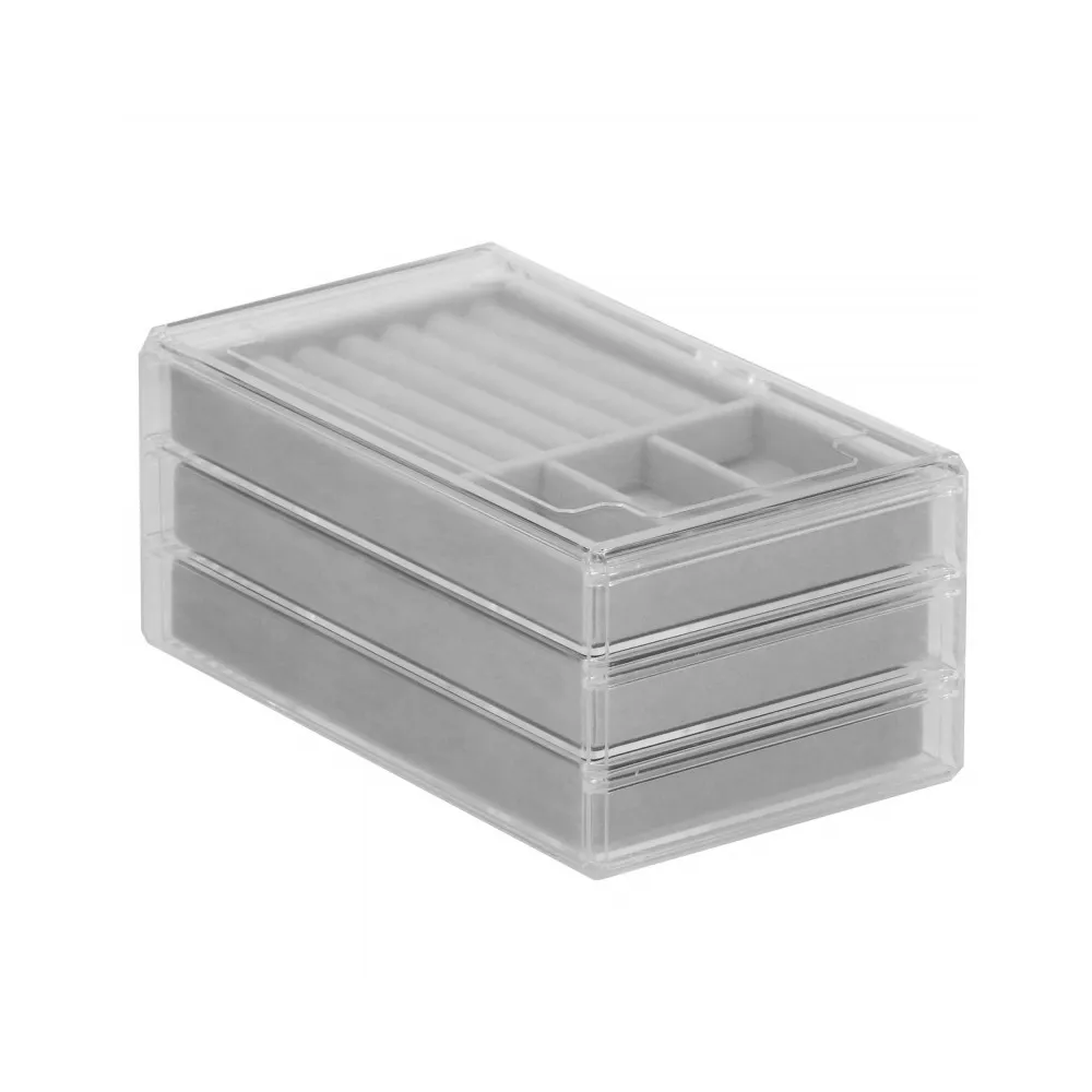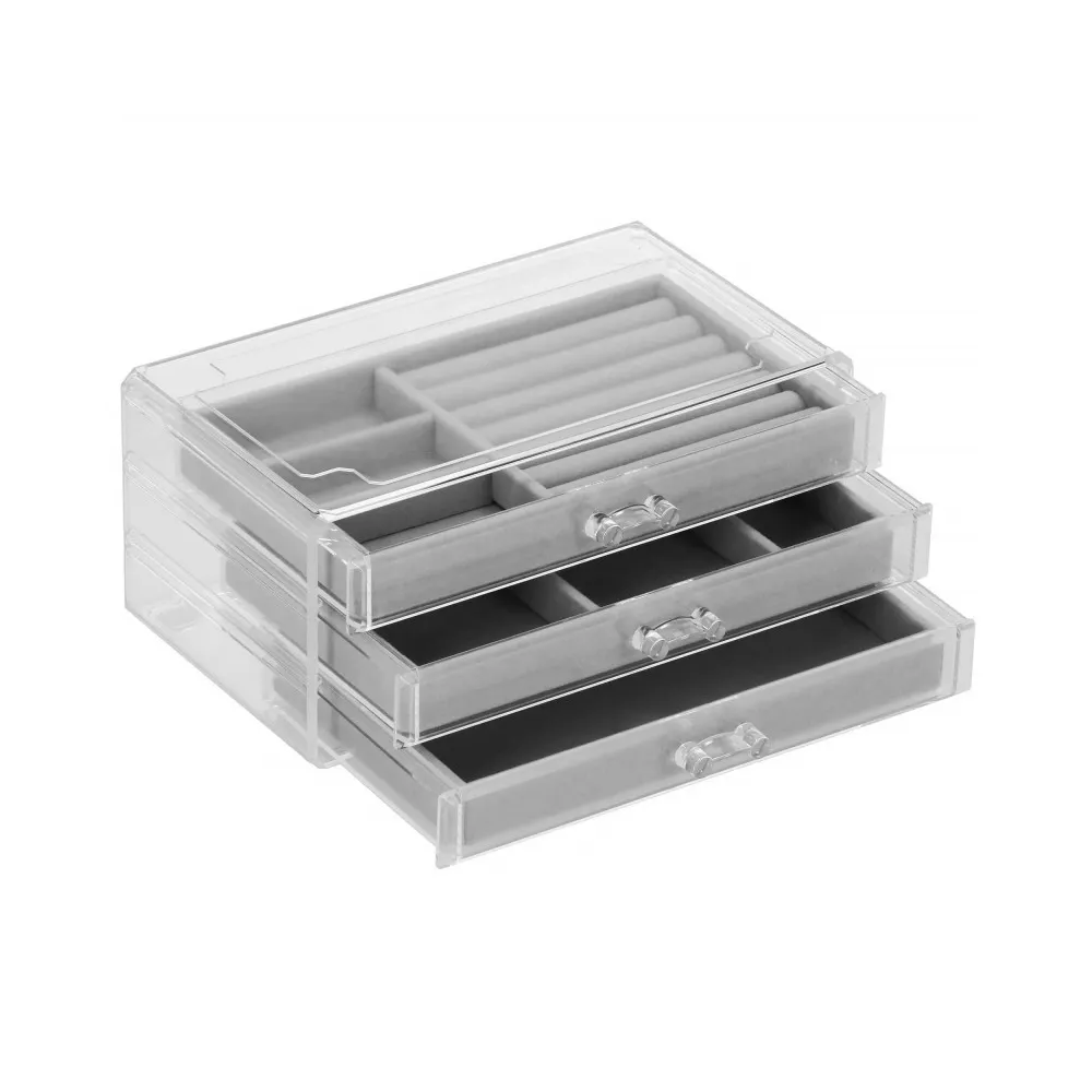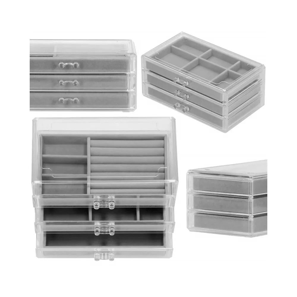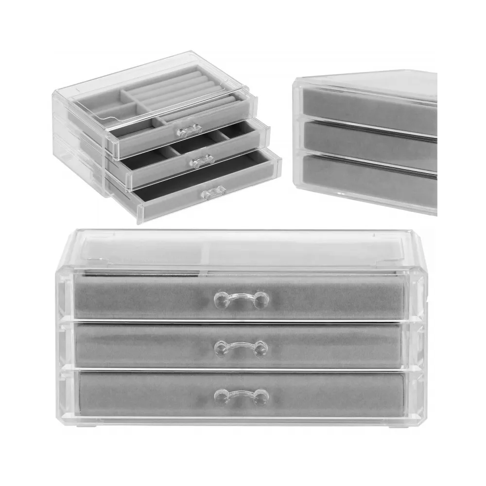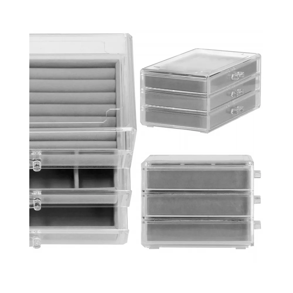 Organizér Vám umožní pohodlné a bezpečné uloženie rôznych druhov prsteňov, retiazok, náramkov, brošne a ďalších doplnkov. Ponúkaný velúrový kufor obsahuje početné priehradky, v ktorých môžete triediť cenné predmety. Vložky sú umiestnené v zásuvkách, čo šetrí miesto. Troj-úrovňový štýlový organizér v priehľadnom plaste je malý a skladný.