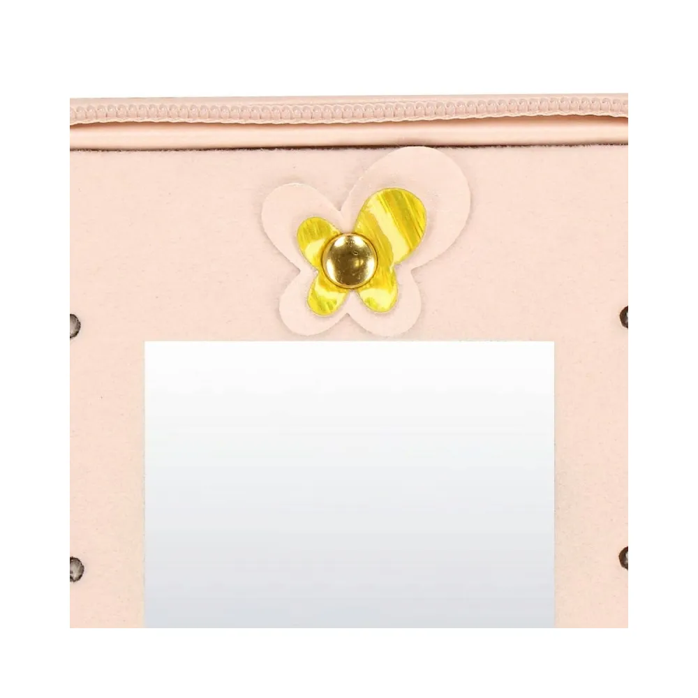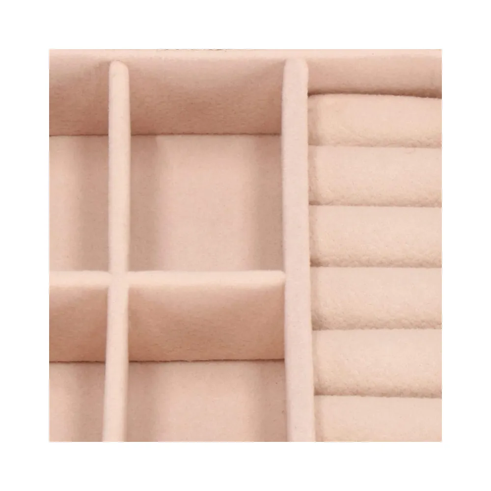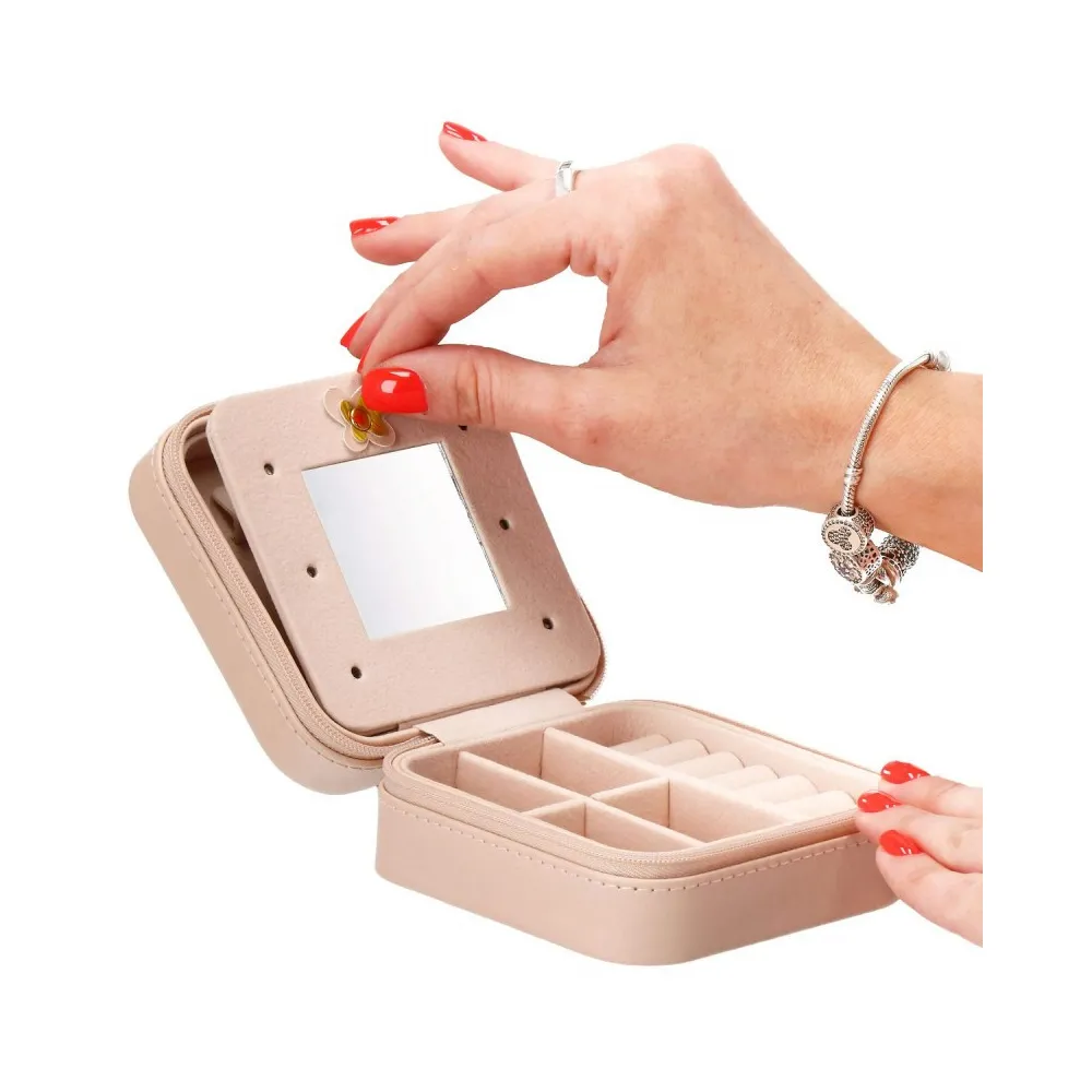 Dizajn je premyslený , vďaka vložke v priehradkách a hornom vrecku a háčikom si šperky ľahko usporiadate. Krúžky stačí umiestniť do podšitej vložky. Zapínanie na zips potom zvyšuje bezpečné skladovanie . Šperkovnica má 10 priehradiek , veľké vrecko s lemom a 3 oká na retiazky. Praktické je tiež zrkadlo s rozmermi 4,5x4,5 cm. Do boxu je možné uložiť retiazky, hodinky, náramky, brošne, korálky, bižutériu a gombíky.